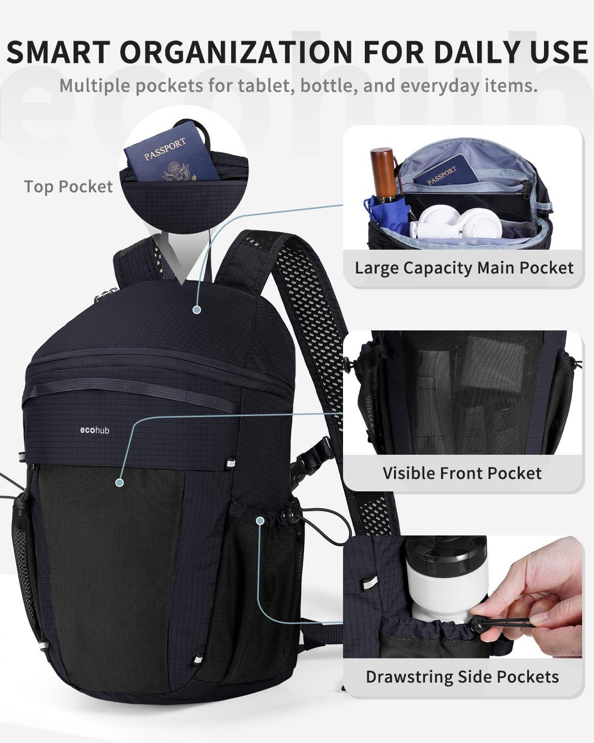imageECOHUB 15L Lightweight Casual Daypack Packable Backpack for Daily Use Hiking amp Travel Foldable Small Backpack with Stretch Mesh Pockets WaterResistant Nylon Reflective DesignBlack