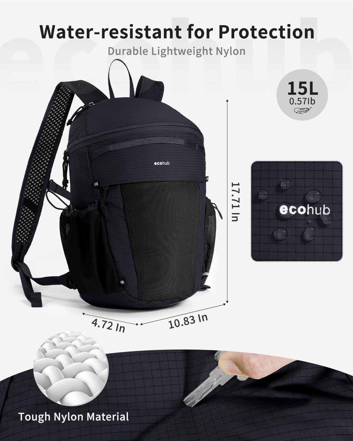 ECOHUB 15L Lightweight Casual Daypack, Packable Backpack for Daily Use, Hiking & Travel, Foldable Small Backpack with Stretch Mesh Pockets, Water-Resistant Nylon, Reflective Design(Black)