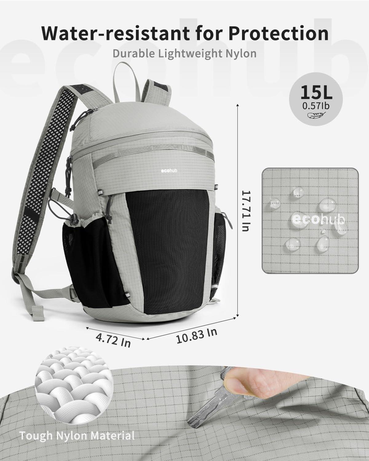 ECOHUB 15L Lightweight Casual Daypack, Packable Backpack for Daily Use, Hiking & Travel, Foldable Small Backpack with Stretch Mesh Pockets, Water-Resistant Nylon, Reflective Design(Grey)