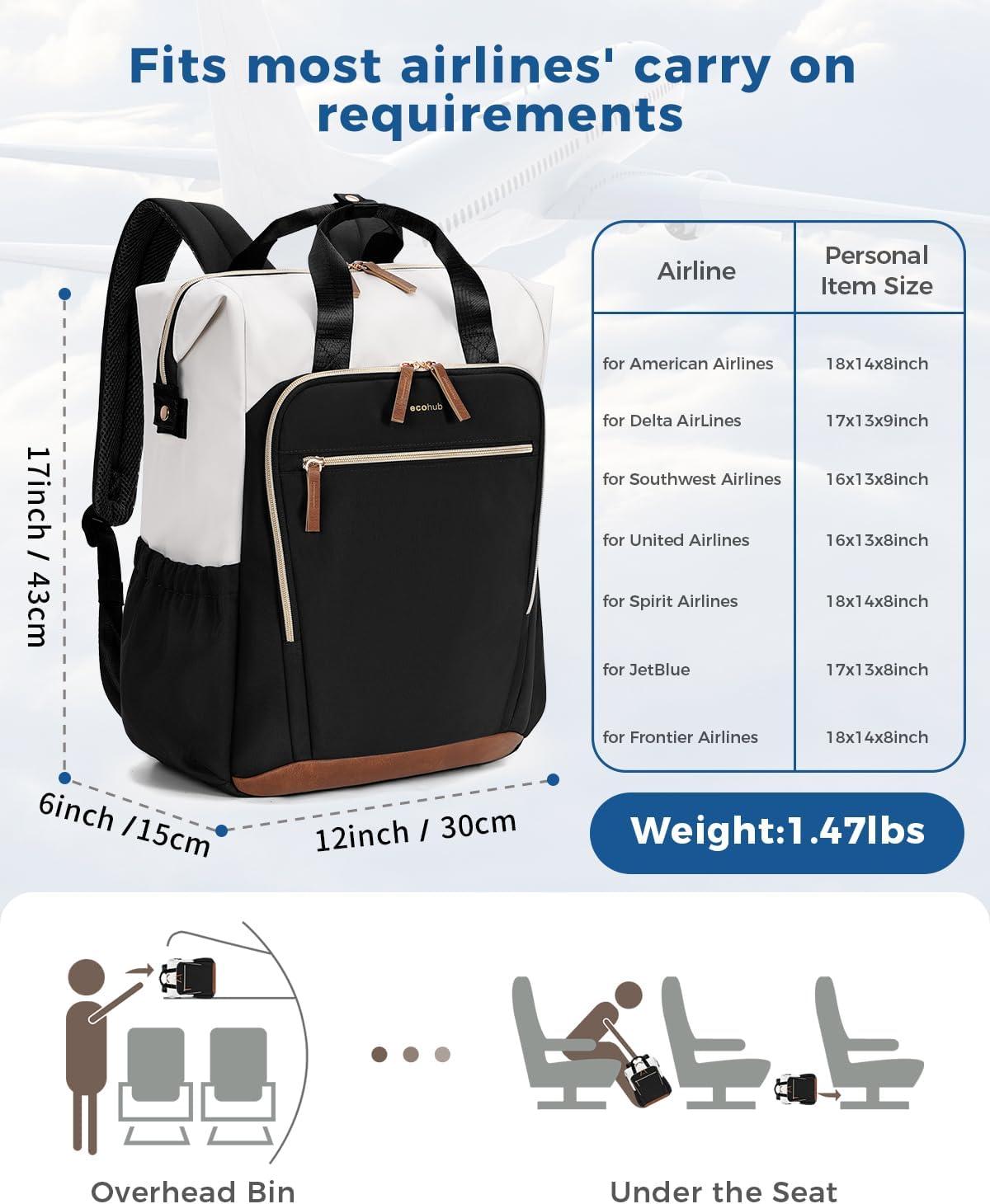 【Airline-Friendly Carry On Backpack】 Designed to meet most US airline personal item requirements, this lightweight travel backpack fits under the seat or in overhead bins. Compact 17”x12”x6” size makes it ideal for flights, weekend trips, and daily commuting.