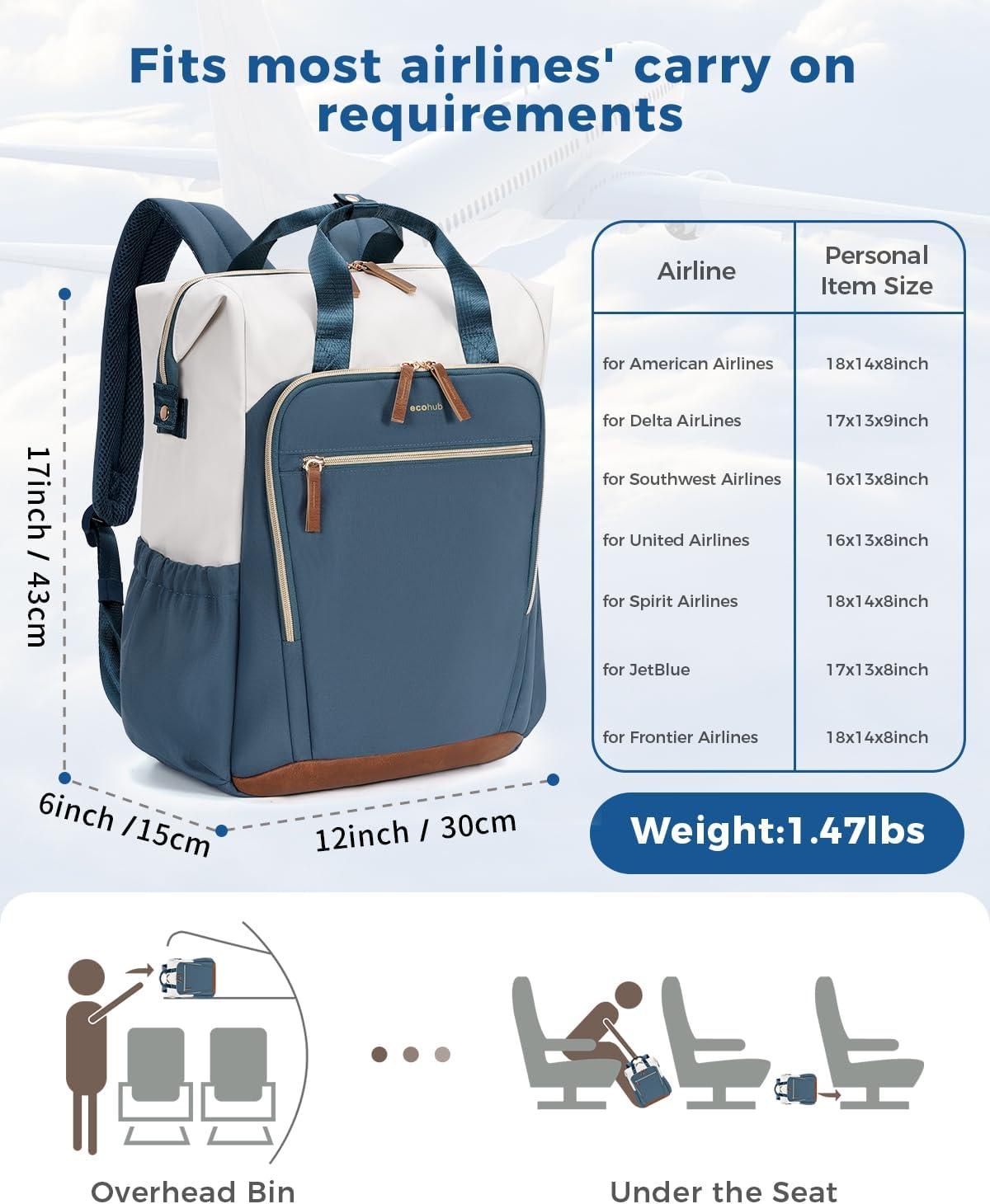 【Airline-Friendly Carry On Backpack】 Designed to meet most US airline personal item requirements, this lightweight travel backpack fits under the seat or in overhead bins. Compact 17”x12”x6” size makes it ideal for flights, weekend trips, and daily commuting.