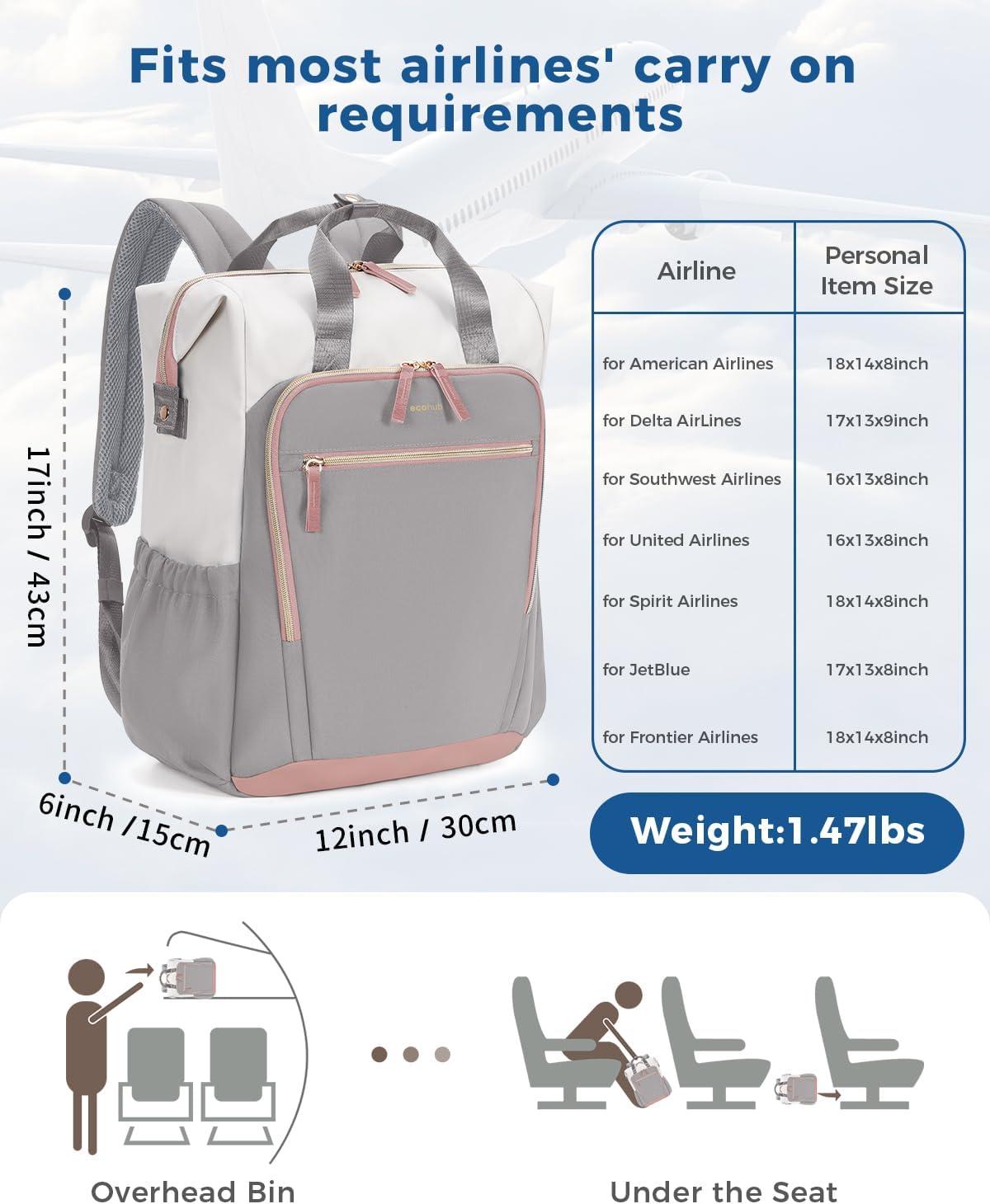 【Airline-Friendly Carry On Backpack】 Designed to meet most US airline personal item requirements, this lightweight travel backpack fits under the seat or in overhead bins. Compact 17”x12”x6” size makes it ideal for flights, weekend trips, and daily commuting.