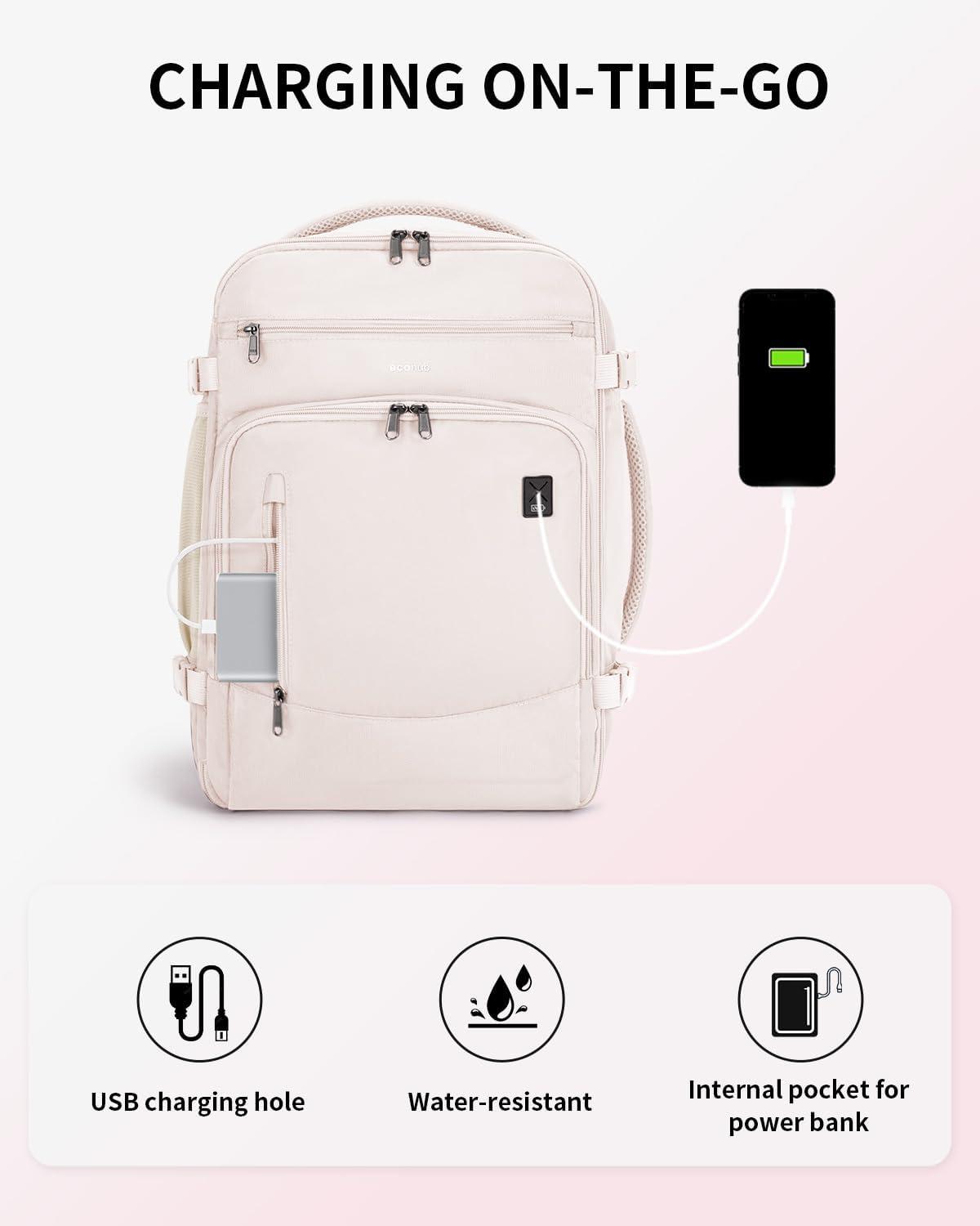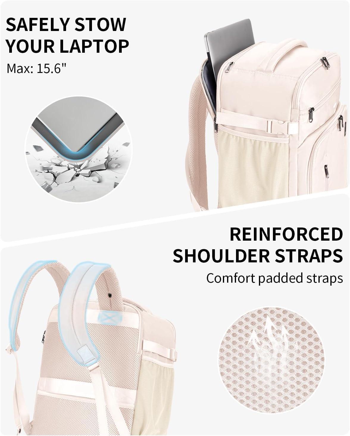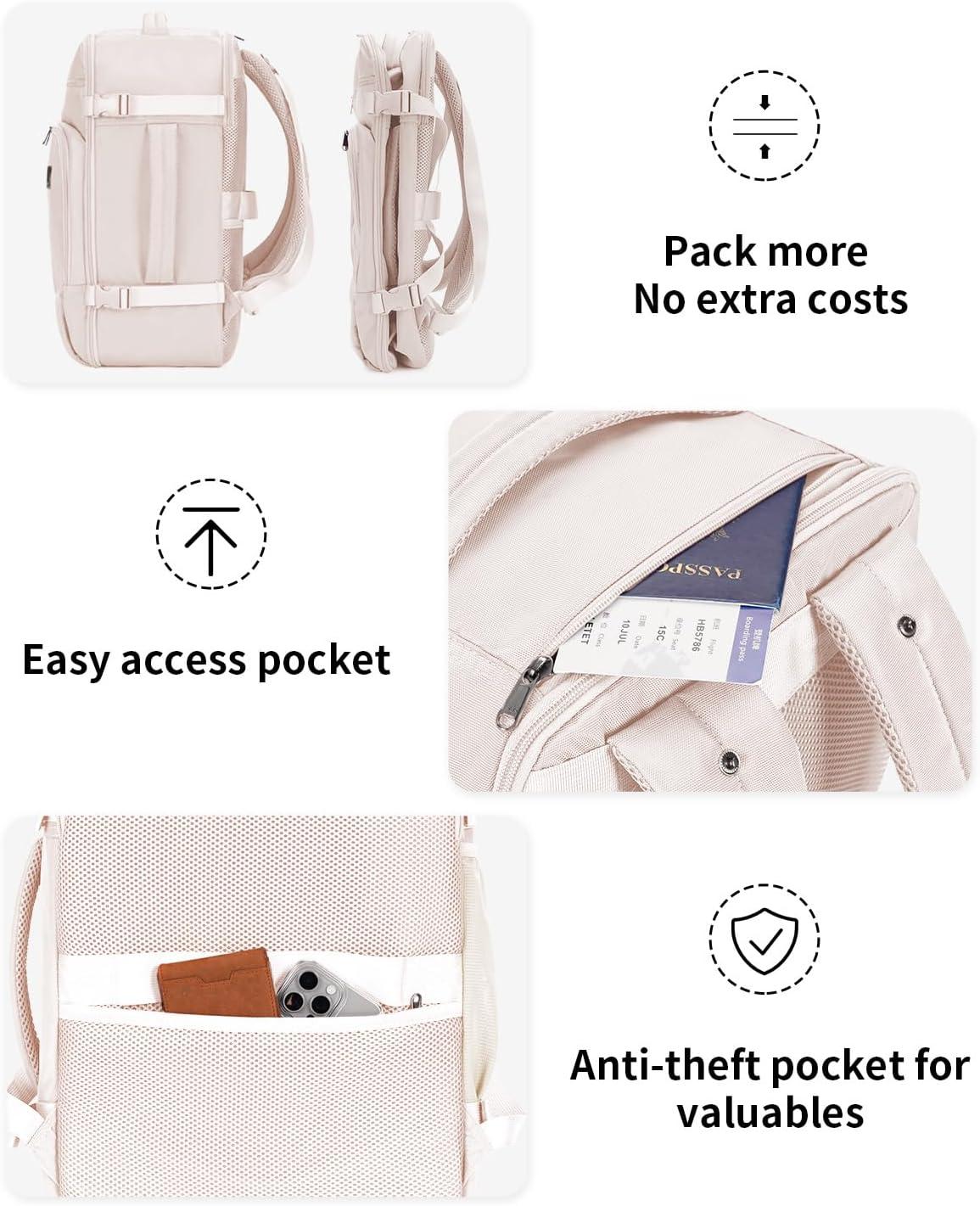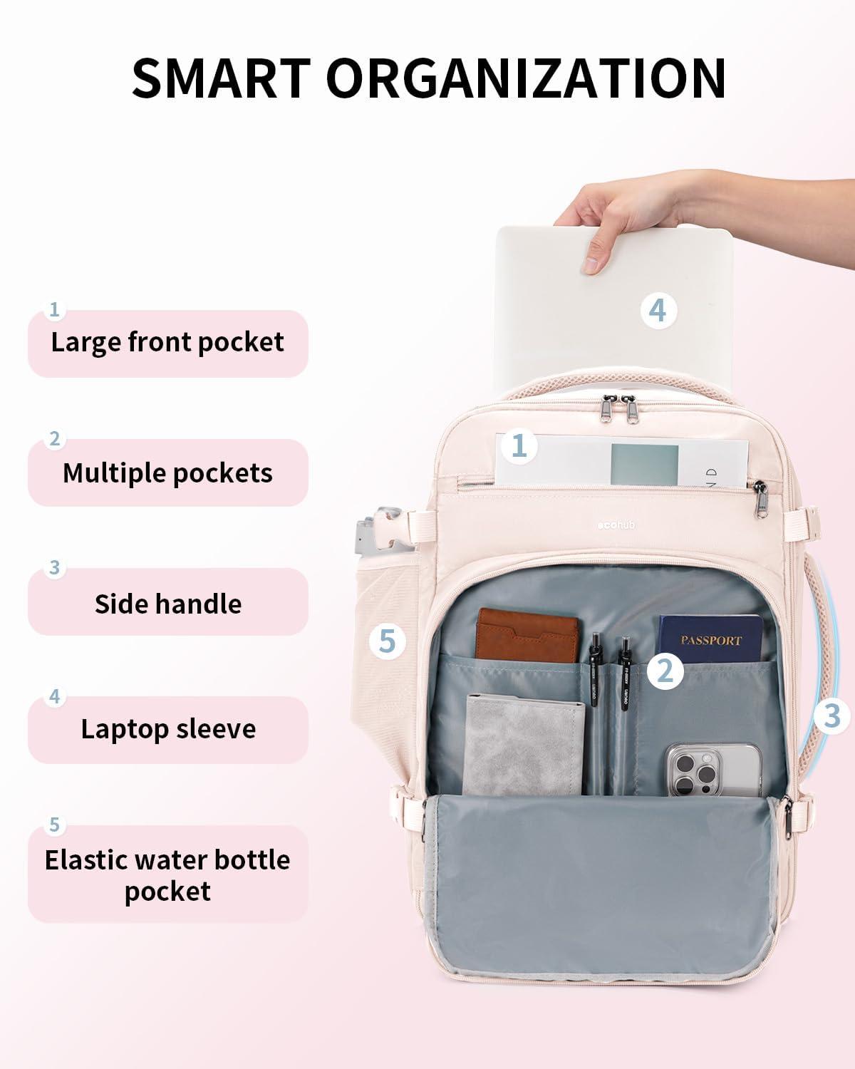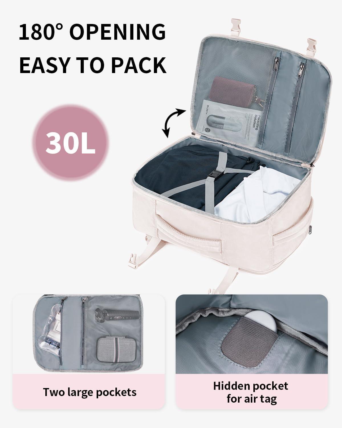 【DESIGNED FOR TRAVEL】: This carry on backpack features a 180° opening for easy packing. The main compartment includes two pockets to keep toiletries and socks organized, with elastic straps to secure your essentials. A dedicated AirTag pocket helps you track your bag easily. Side compression straps compact the bag, while the side handle and trolley sleeve provide multiple carrying options for added convenience.