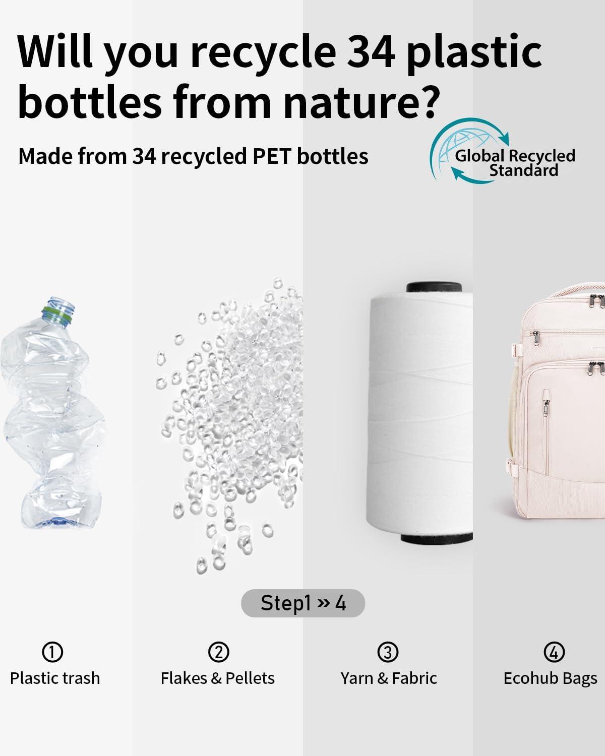 【SUSTAINABLE AND GUARANTEE】: Our personal item backpack is made from at least 50% recycled materials, with fabric and lining crafted from 30 recycled PET plastic bottles. The water-resistant, lightweight fabric, combined with heavy-duty SBS zippers and reinforced ripstop stitching, ensure durability for any adventure. If you have any concerns, reach out through your order. (Patent Pending)