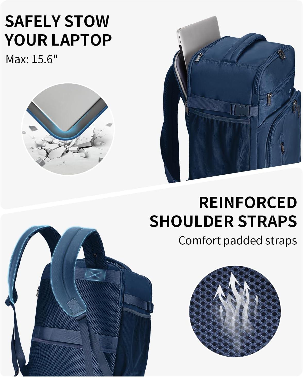 【DESIGNED FOR TRAVEL】: This carry on backpack features a 180° opening for easy packing. The main compartment includes two pockets to keep toiletries and socks organized, with elastic straps to secure your essentials. A dedicated AirTag pocket helps you track your bag easily. Side compression straps compact the bag, while the side handle and trolley sleeve provide multiple carrying options for added convenience.