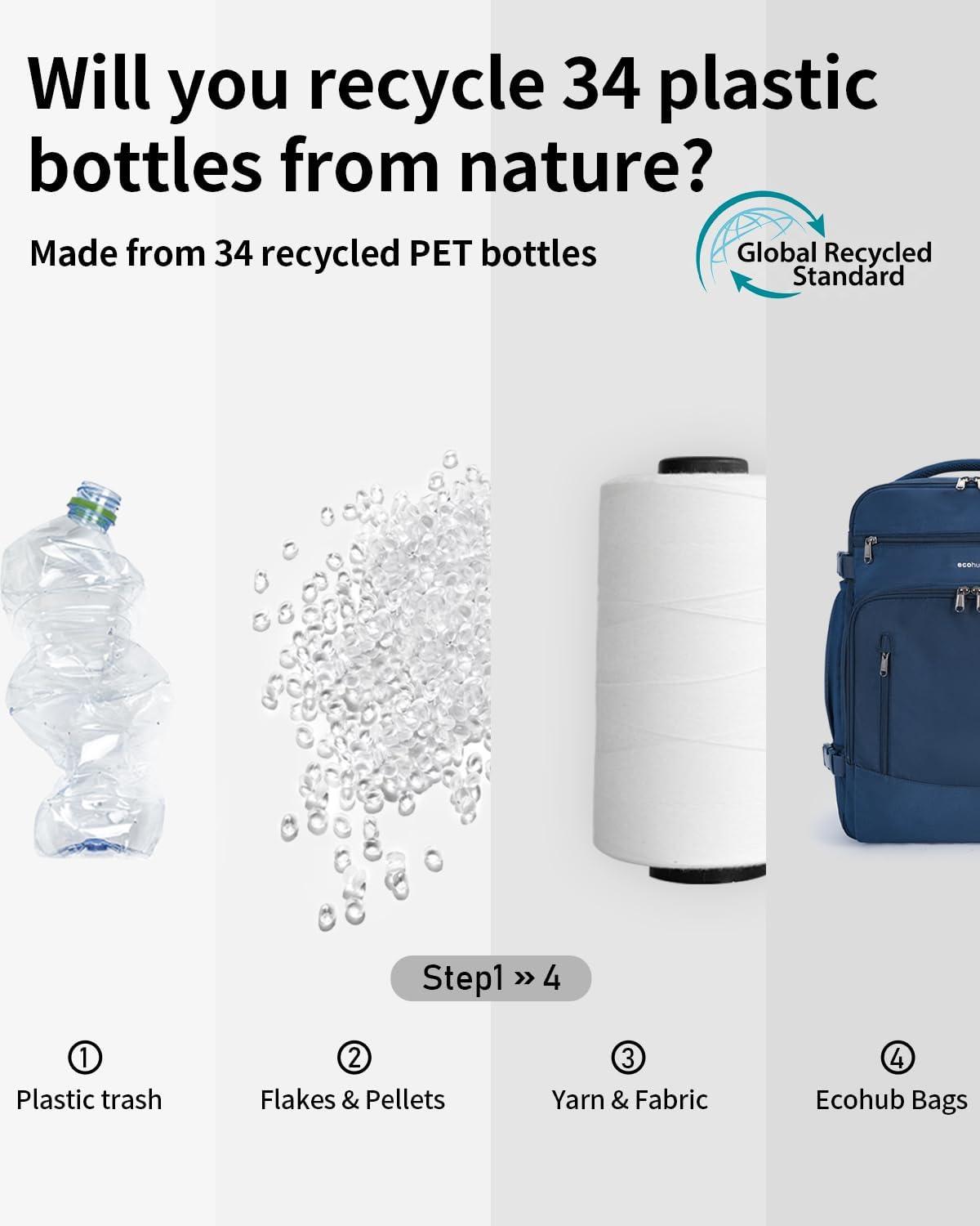 【SUSTAINABLE AND GUARANTEE】: Our personal item backpack is made from at least 50% recycled materials, with fabric and lining crafted from 30 recycled PET plastic bottles. The water-resistant, lightweight fabric, combined with heavy-duty SBS zippers and reinforced ripstop stitching, ensure durability for any adventure. If you have any concerns, reach out through your order. (Patent Pending)