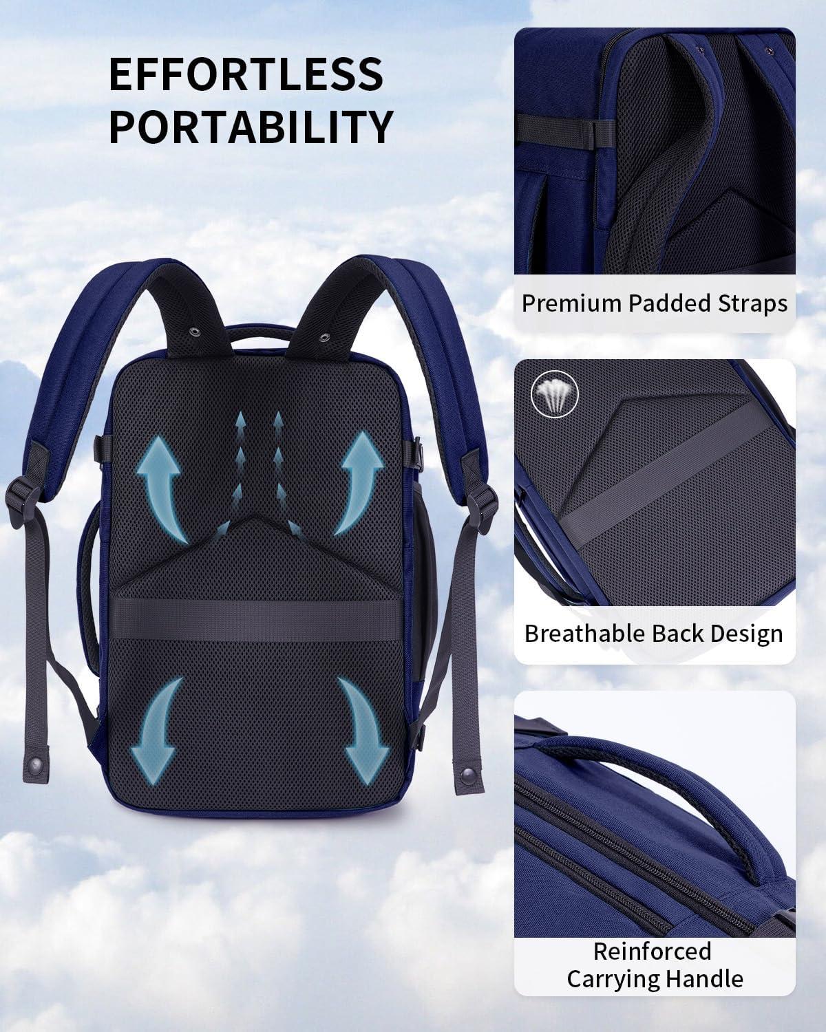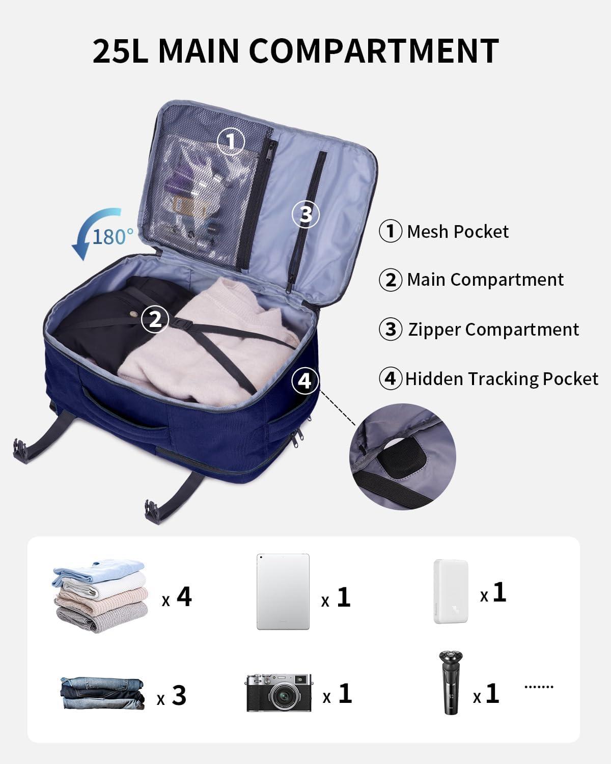 【DESIGNED FOR TRAVEL】: This carry on backpack features a 180° opening for easy packing. The main compartment includes two pockets to keep toiletries and socks organized, with elastic straps to secure your essentials. A dedicated AirTag pocket helps you track your bag easily. Side compression straps compact the bag, while the side handle and trolley sleeve provide multiple carrying options for added convenience.