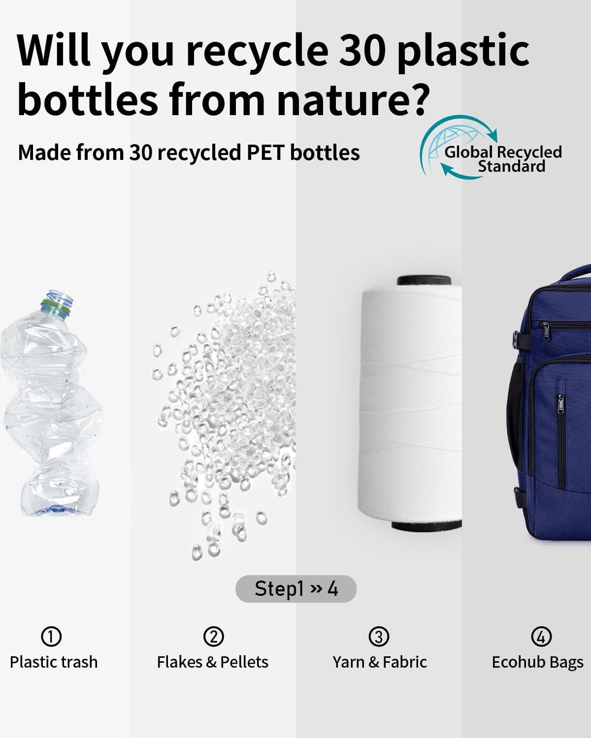 【SUSTAINABLE AND GUARANTEE】: Our personal item backpack is made from at least 50% recycled materials, with fabric and lining crafted from 30 recycled PET plastic bottles. The water-resistant, lightweight fabric, combined with heavy-duty SBS zippers and reinforced ripstop stitching, ensure durability for any adventure. If you have any concerns, reach out through your order. (Patent Pending)