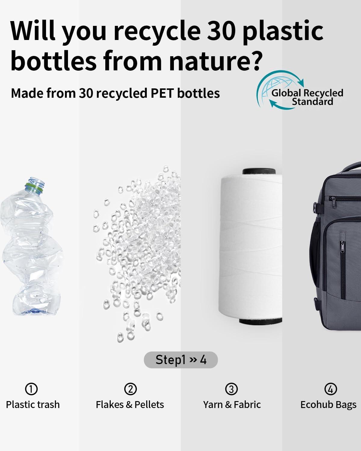 【SUSTAINABLE AND GUARANTEE】: Our personal item backpack is made from at least 50% recycled materials, with fabric and lining crafted from 30 recycled PET plastic bottles. The water-resistant, lightweight fabric, combined with heavy-duty SBS zippers and reinforced ripstop stitching, ensure durability for any adventure. If you have any concerns, reach out through your order. (Patent Pending)