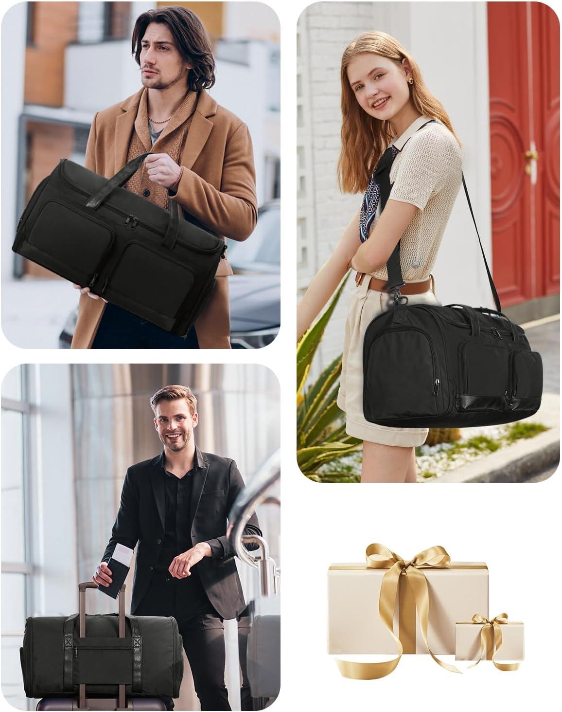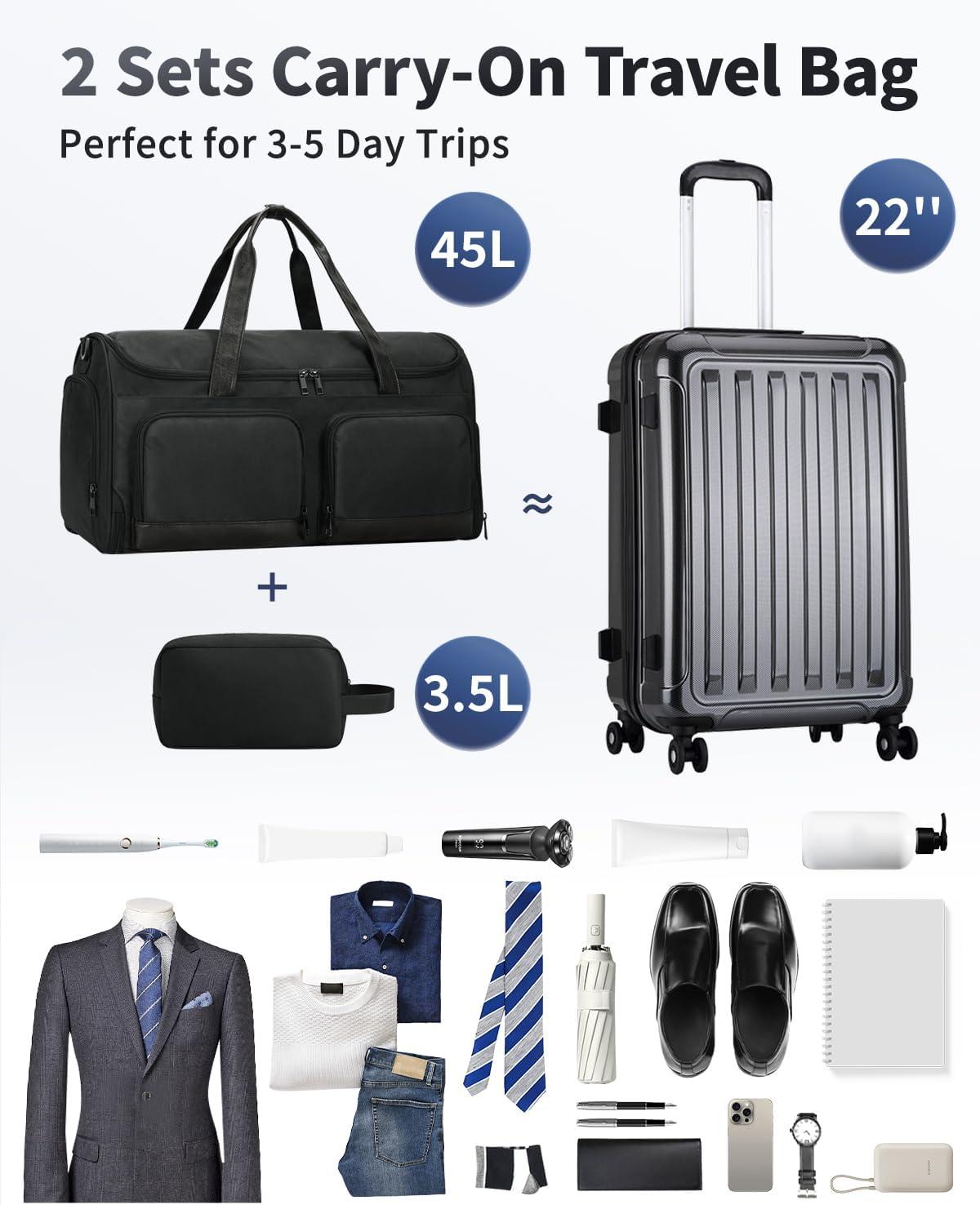 Generous 45L Capacity: With a 21x12x11 inch size, this bag offers ample space for packing clothes, shoes, toiletries, and more. Made from durable, water-resistant fabric, it fits 3-5 day trip essentials and meets most airlines' carry-on requirements. (Patent pending)