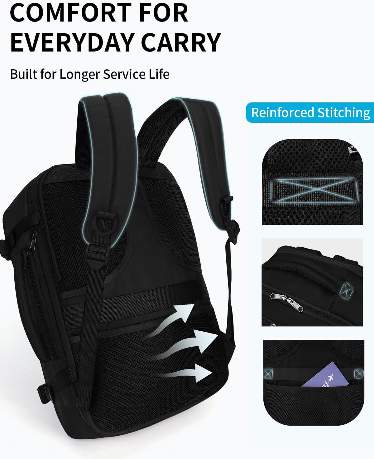 【Comfy&Sturdy】: The carry on backpack adopting a comfortable airflow back design with thick but soft panel ventilated padding, compliant with ergonomics.At the same time, padded shoulder straps evenly distribute weight and adjustable shoulder straps reduce shoulder pressure, providing you with maximum back support.