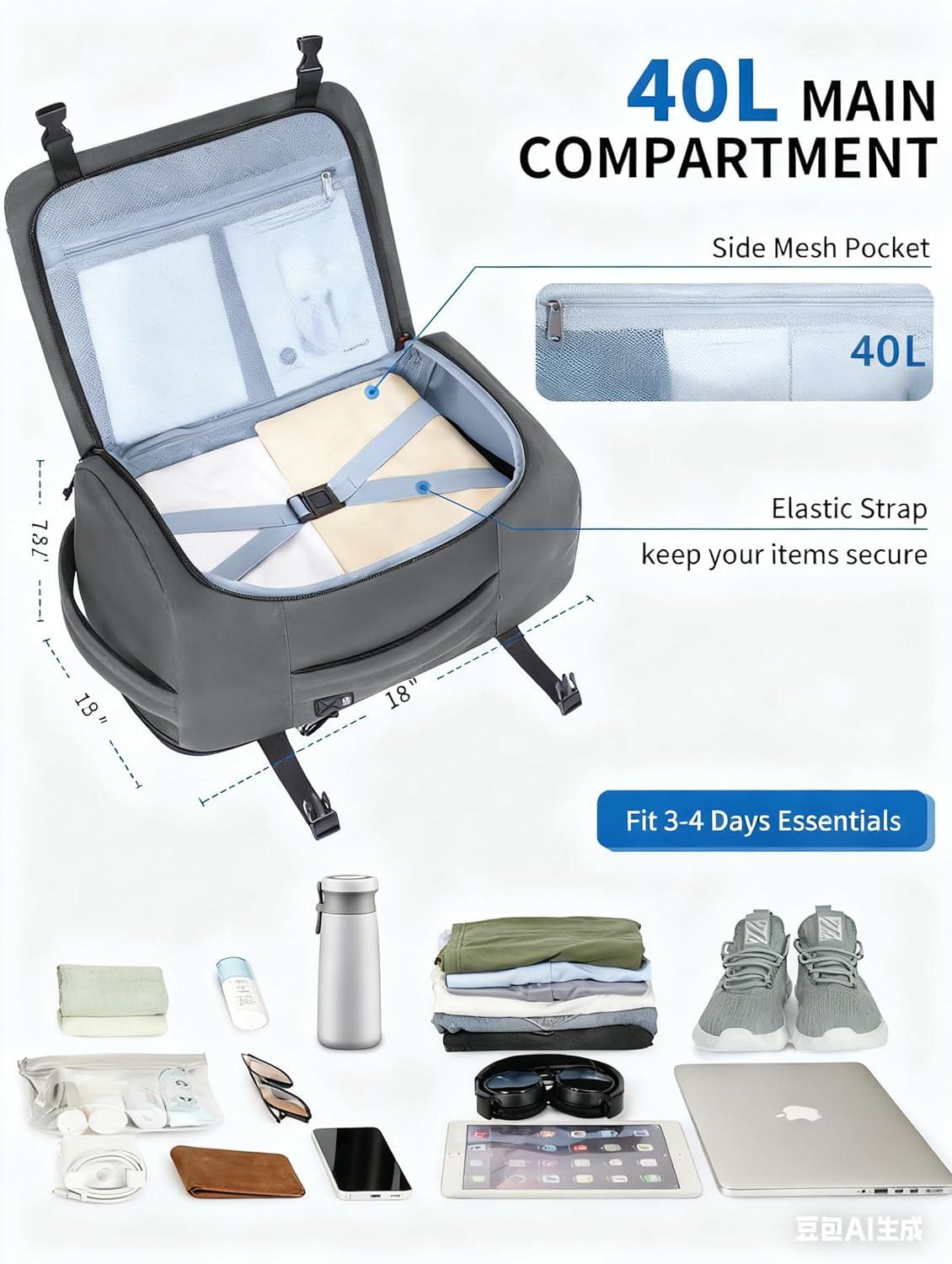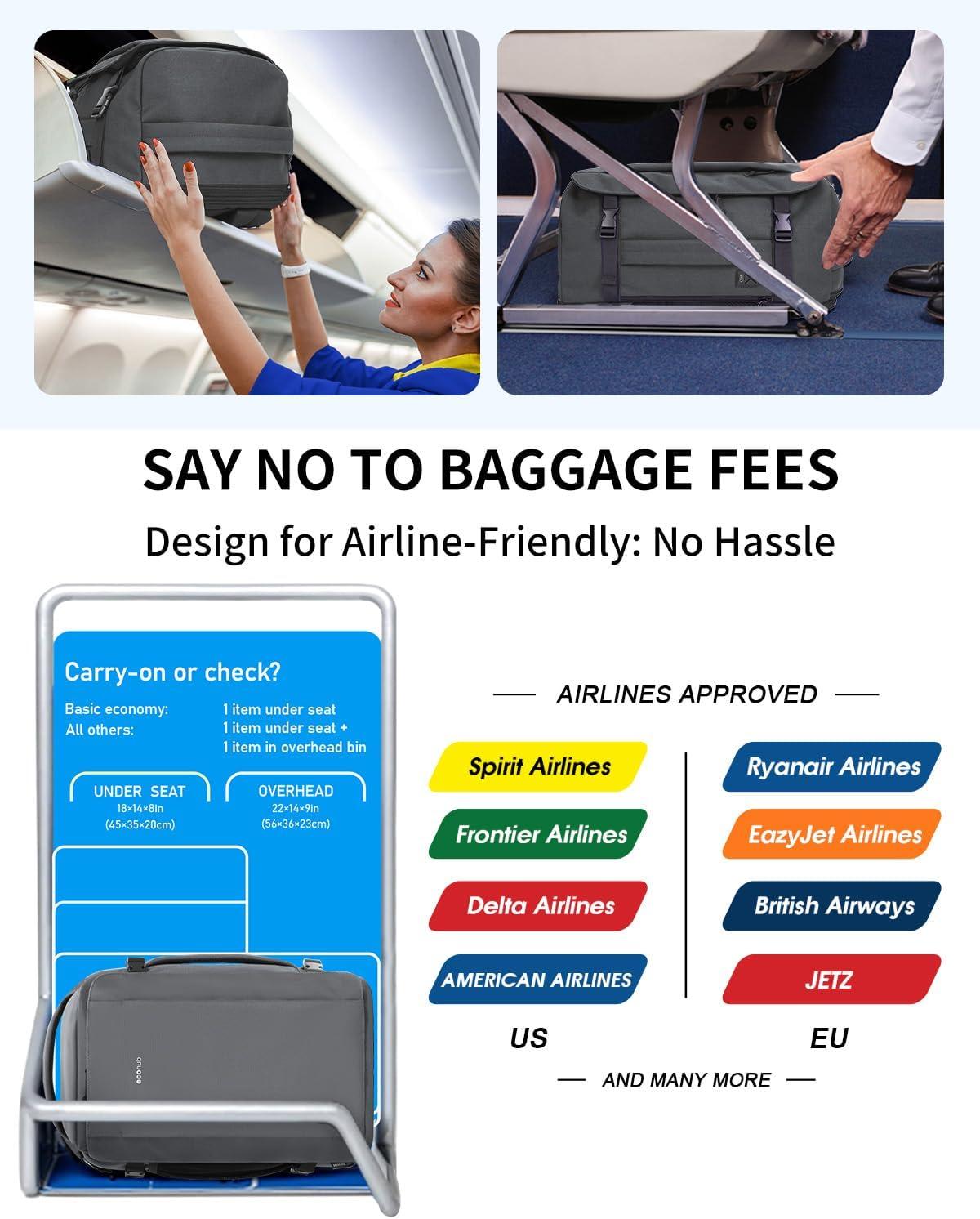 【OUTSMART AIRLINE BAGGAGE FEES】ECOHUB's travel backpack is engineered with the airline-approved dimensions to skip extra charges entirely. Sized at 18x13x7.8 inches—perfect for slipping under the seat—it holds 30L of essentials (that's 2-3 days of gear!) while weighing just 1.6 lbs. Airlines like Spirit, Frontier, Delta, and EasyJet? We've got their baggage rules covered. No more stress at the gate—this bag is your ticket to flying light and keeping your wallet heavy