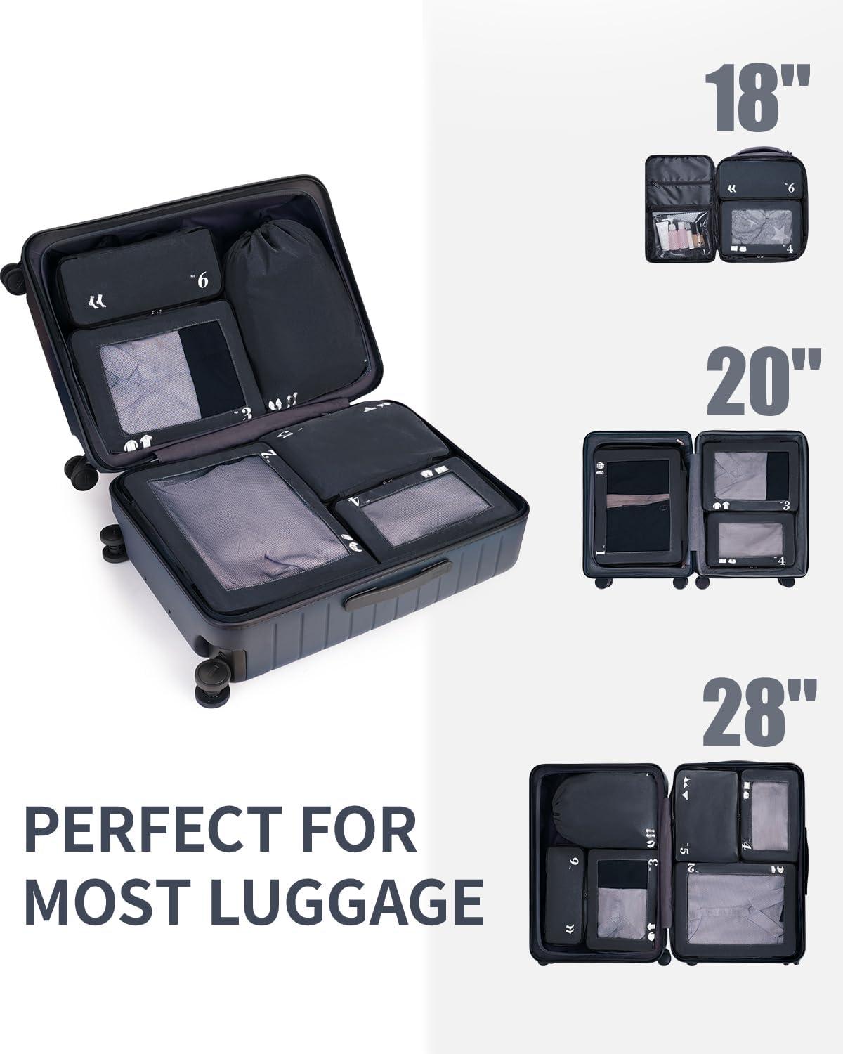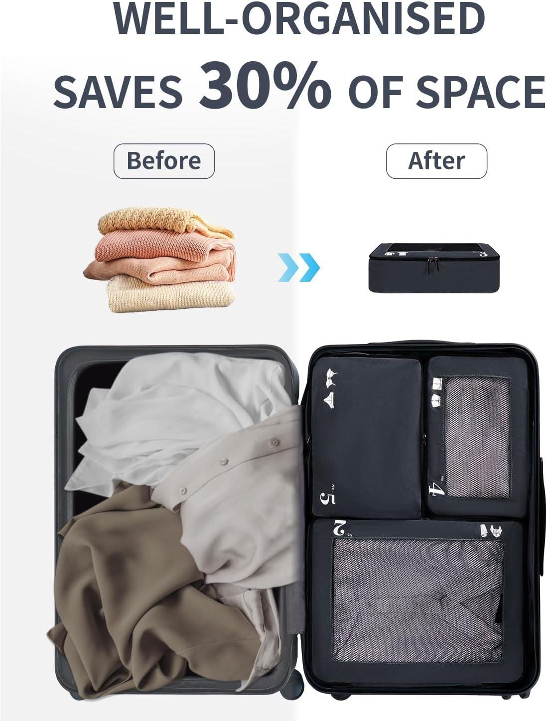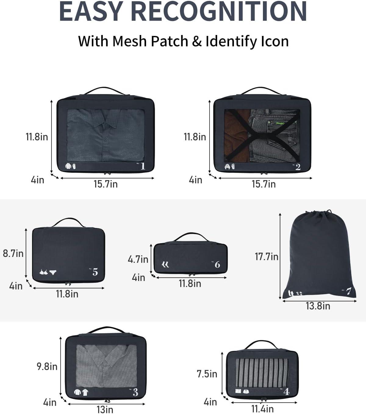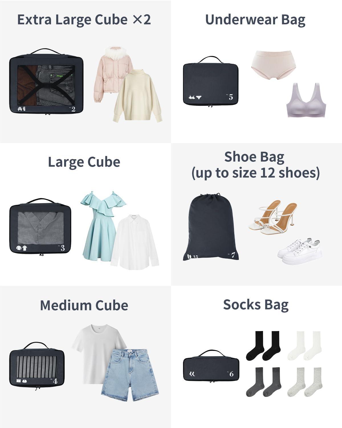 【Keep Your Items Organized】:ECOHUB 5 set suitcase organizer bags set are for different requeirs and there are number icons for easy distinguish. No.1 Large bag is suitable for your coat. No.2 and No.3 bags are medium size, you can put your tops and pants in them. N0.4 underwear bag to separate your personal item from other clothes and keep their privatecy. The No.5 drawstring shoes bag keeps your shoes separated. These 5 set packing cubes keep you highly organized all trip long.