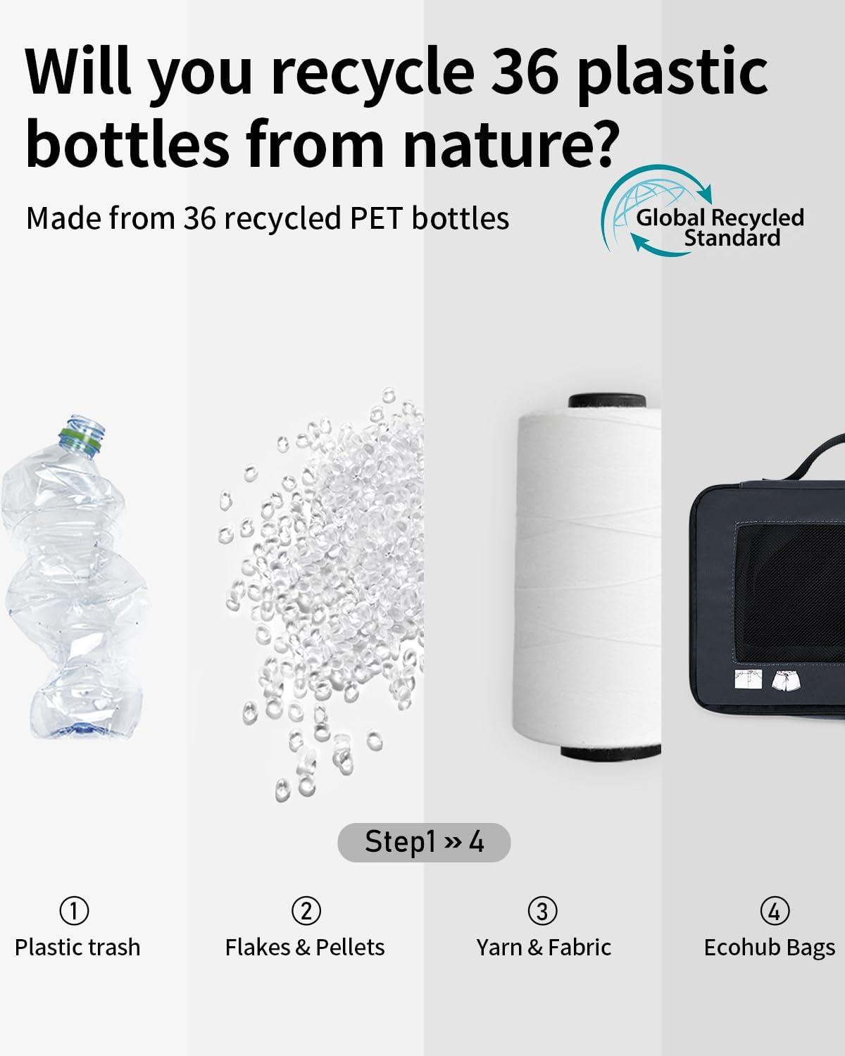 【SUSTAINABLE AND GUARANTEE】: ECOHUB travel packing cubes are made from at least 50% recycled materials, with fabric and lining crafted from 26 recycled PET plastic bottles. The lightweight fabric combined with YKK zippers and reinforced ripstop stitching, ensure durability for any adventure. If you have any concerns, reach out through your order. (Patent Pending)