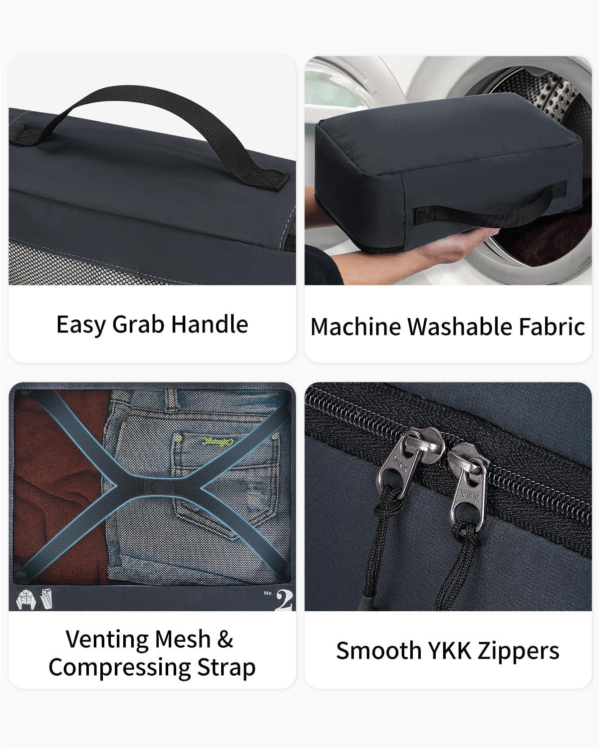 【Compression Design Save More Space】: ECOHUB compressible packing cubes come with an extra zippered section for content compression. Comprssion zippers allow 10cm expansion. Unzip the compressed part, then have room to expand and add more items later. Compression design saves you space inside your luggage by pressing the air out of mesh and zipping up. Adjust and maximize your packing space while keeping your items easily accessed.(PATENT PENDING)