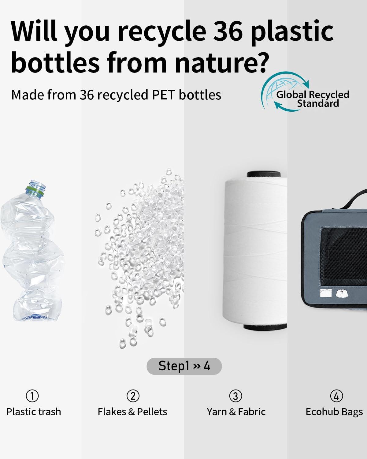 【SUSTAINABLE AND GUARANTEE】: ECOHUB travel packing cubes are made from at least 50% recycled materials, with fabric and lining crafted from 26 recycled PET plastic bottles. The lightweight fabric combined with YKK zippers and reinforced ripstop stitching, ensure durability for any adventure. If you have any concerns, reach out through your order. (Patent Pending)