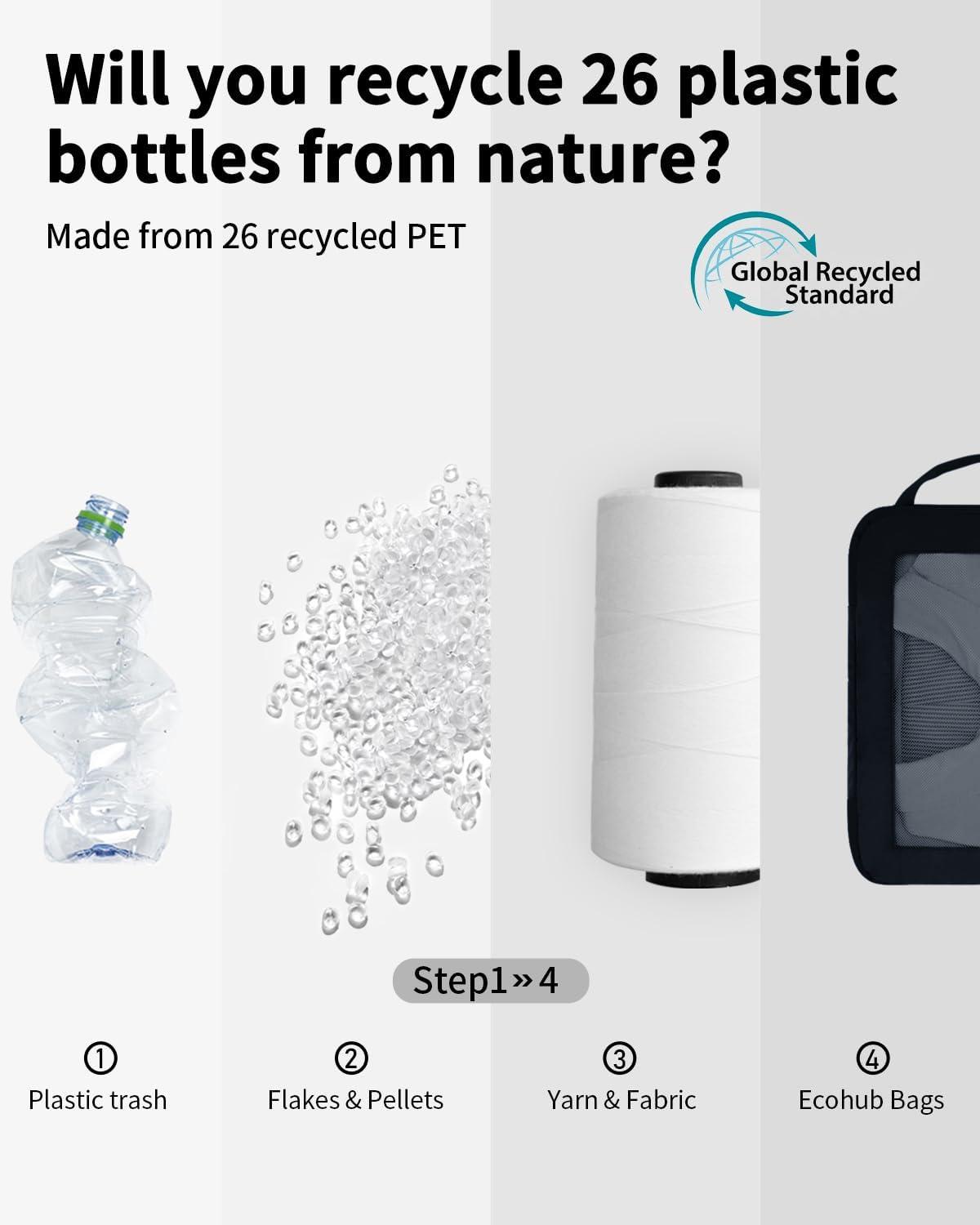 【SUSTAINABLE AND GUARANTEE】: ECOHUB travel packing cubes are made from at least 50% recycled materials, with fabric and lining crafted from 26 recycled PET plastic bottles. The lightweight fabric combined with YKK zippers and reinforced ripstop stitching, ensure durability for any adventure. If you have any concerns, reach out through your order. (Patent Pending)