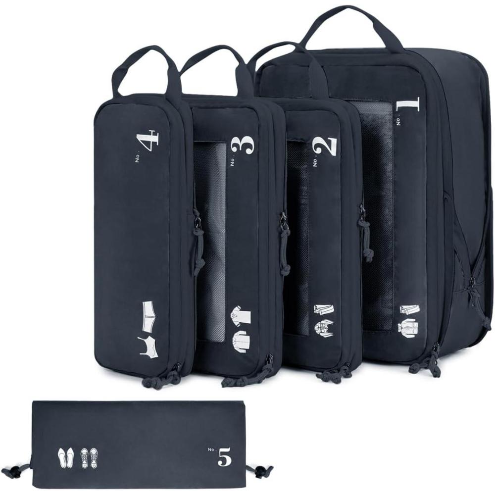 【Keep Your Items Organized】:ECOHUB 5 set suitcase organizer bags set are for different requeirs and there are number icons for easy distinguish. No.1 Large bag is suitable for your coat. No.2 and No.3 bags are medium size, you can put your tops and pants in them. N0.4 underwear bag to separate your personal item from other clothes and keep their privatecy. The No.5 drawstring shoes bag keeps your shoes separated. These 5 set packing cubes keep you highly organized all trip long.