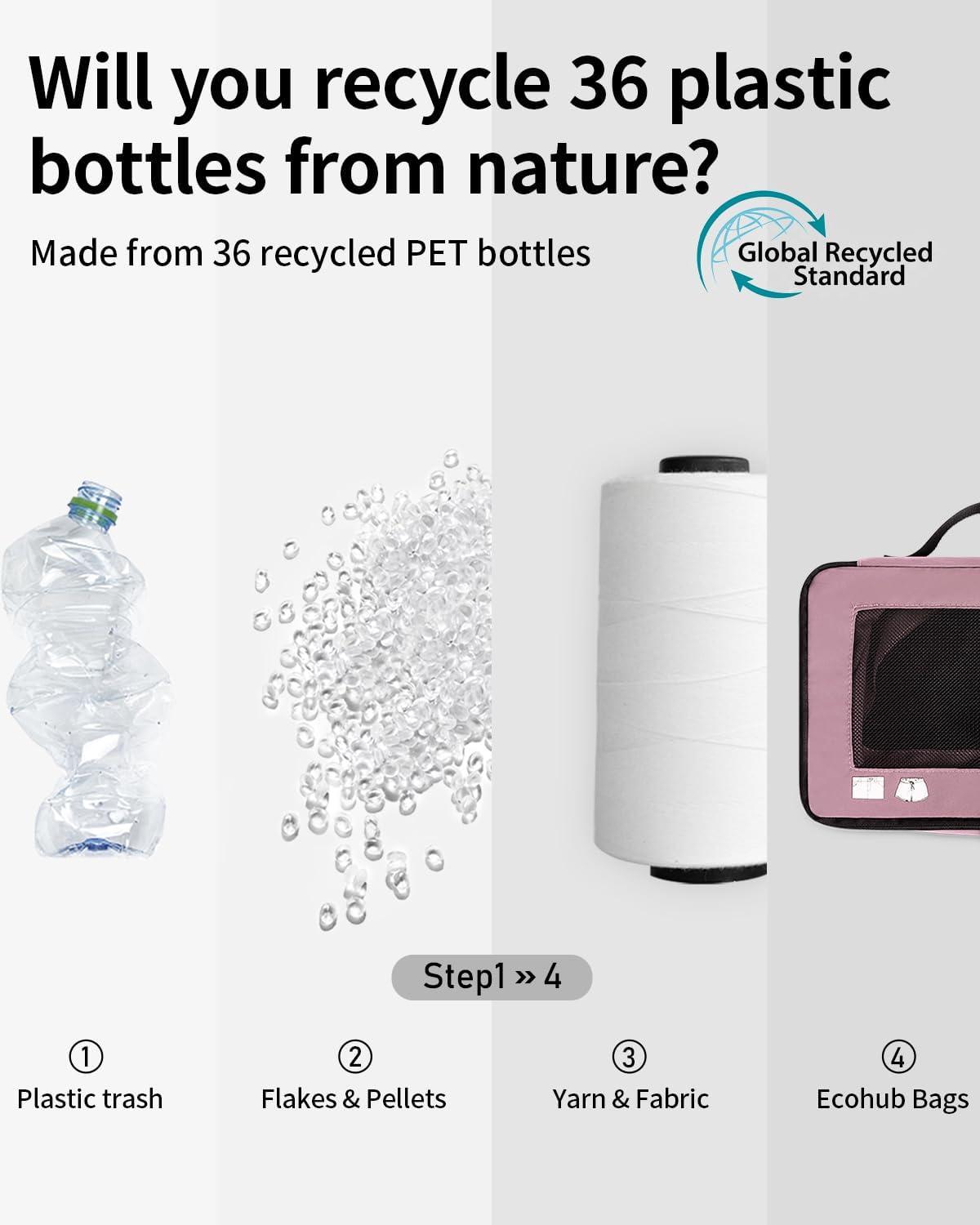 【SUSTAINABLE AND GUARANTEE】: ECOHUB travel packing cubes are made from at least 50% recycled materials, with fabric and lining crafted from 26 recycled PET plastic bottles. The lightweight fabric combined with YKK zippers and reinforced ripstop stitching, ensure durability for any adventure. If you have any concerns, reach out through your order. (Patent Pending)