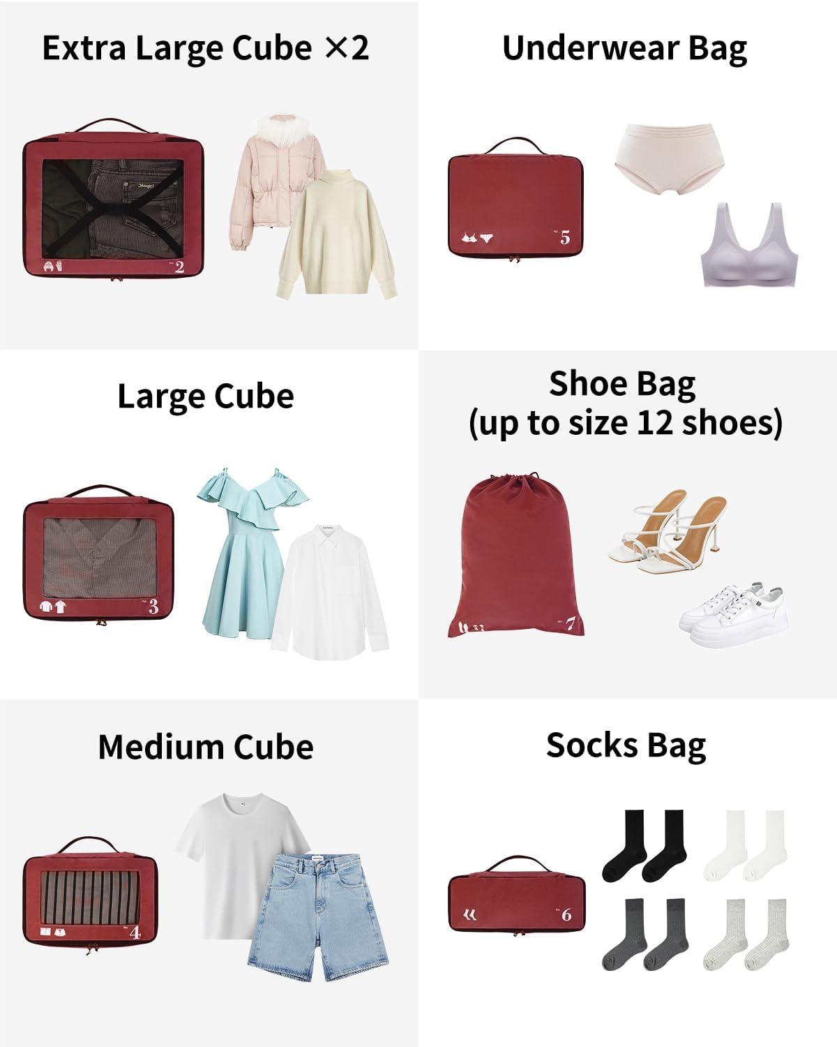 【Keep Your Items Organized】:ECOHUB 5 set suitcase organizer bags set are for different requeirs and there are number icons for easy distinguish. No.1 Large bag is suitable for your coat. No.2 and No.3 bags are medium size, you can put your tops and pants in them. N0.4 underwear bag to separate your personal item from other clothes and keep their privatecy. The No.5 drawstring shoes bag keeps your shoes separated. These 5 set packing cubes keep you highly organized all trip long.