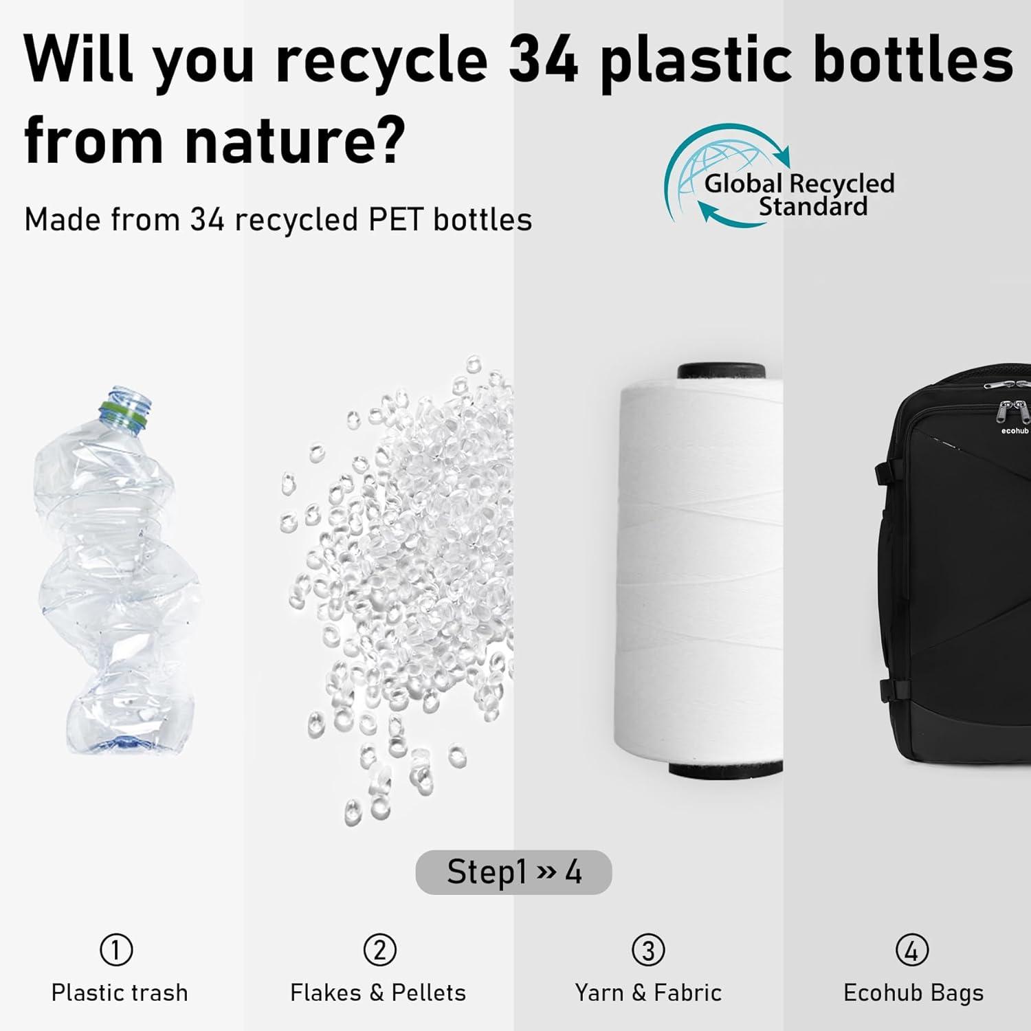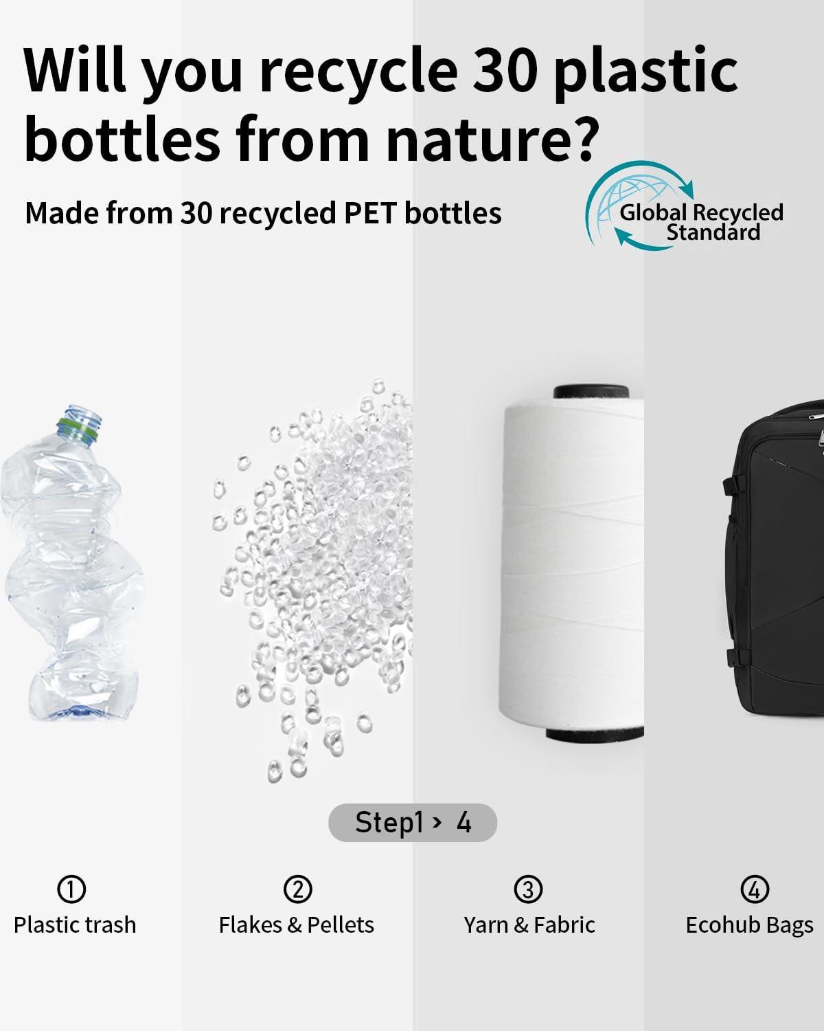【Relieve Pressure, Travel Better】This commuter backpack features adjustable, breathable padded shoulder straps and an ergonomic back pad for ultimate comfort on the go. The padded straps evenly distribute weight to reduce strain on your shoulders, making it perfect for long commutes or trips. Plus, this carryon backpack made from at least 50% recycled materials, with fabric and lining crafted from 34 recycled PET plastic bottles. Travel sustainably and comfortably!