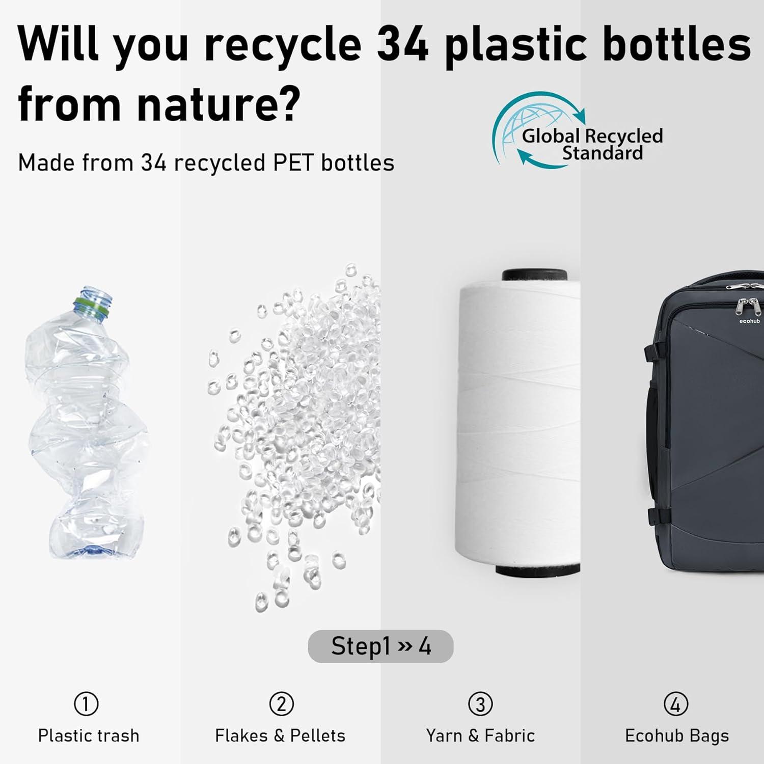 【Relieve Pressure, Travel Better】This commuter backpack features adjustable, breathable padded shoulder straps and an ergonomic back pad for ultimate comfort on the go. The padded straps evenly distribute weight to reduce strain on your shoulders, making it perfect for long commutes or trips. Plus, this carryon backpack made from at least 50% recycled materials, with fabric and lining crafted from 34 recycled PET plastic bottles. Travel sustainably and comfortably!