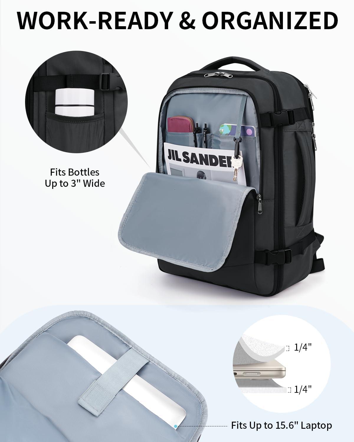 【Work-Ready, Stay Organized】Features a 17” laptop compartment that fits thick laptops up to 16″ and slim ones up to 17″. As a multi-pocket backpack, it includes 12 pockets to keep everything organized. Despite its expandable design, there’s a pocket for water bottles up to 3″ wide and a USB slot for convenient charging—making it work-ready! Additionally, a large wet pocket keeps your items dry, and reinforced stitching ensures this backpack is built to last.
