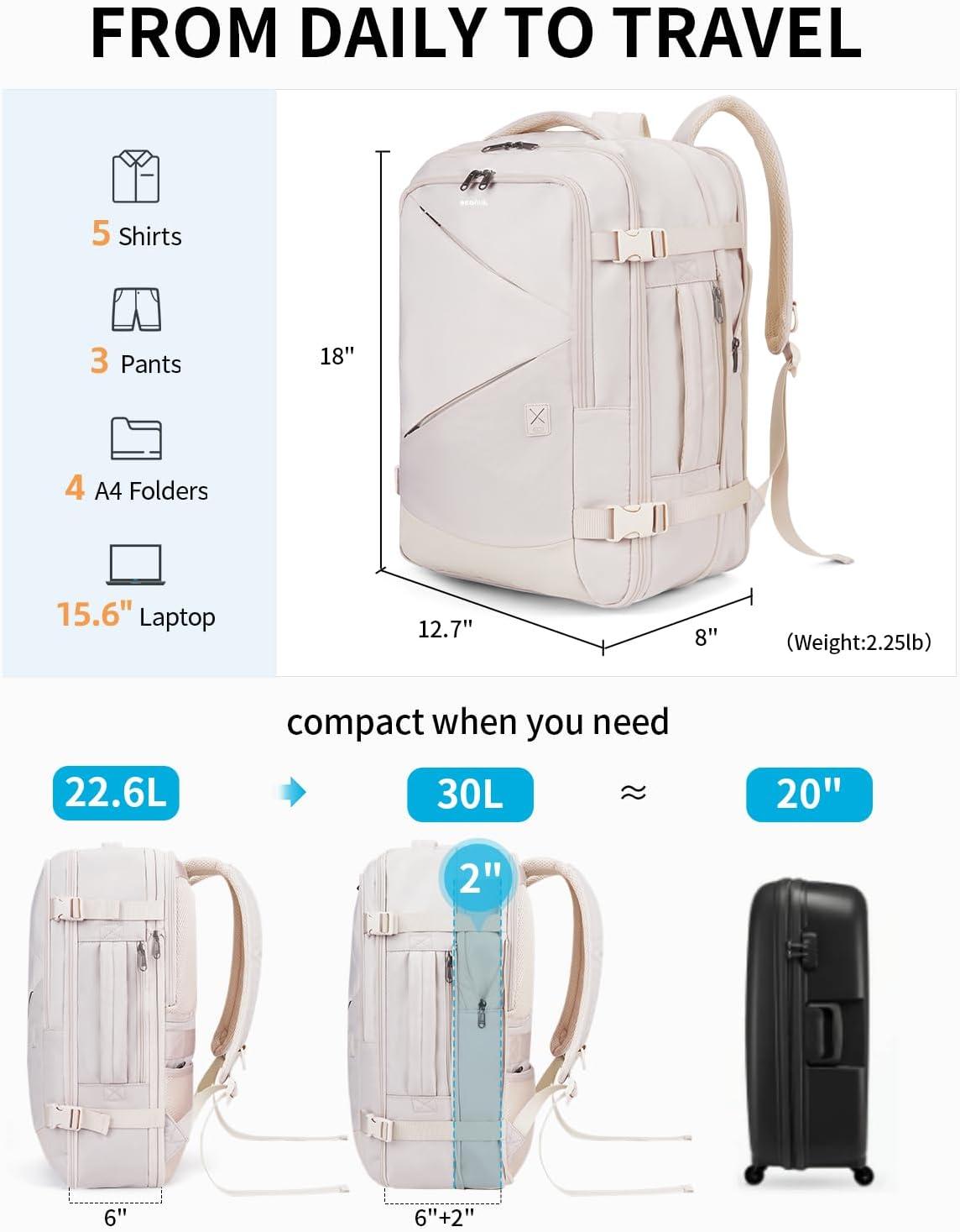 【22.6L/30L, From Daily to Travel】This expandable travel backpack adjusts from 18″ x 12.7″ x 6″ (22.6L) to 18″ x 12.7″ x 8″ (30L), providing flexible storage for your essentials—ideal for 2-4 day trips and daily work. It meets carry-on size requirements for major U.S. airlines like American, Delta, United, and Alaska, letting you travel WITHOUT BAGGAGE FEES. With high-quality SBS zippers, enjoy effortless access and long-lasting durability. (PATENT PENDING)
