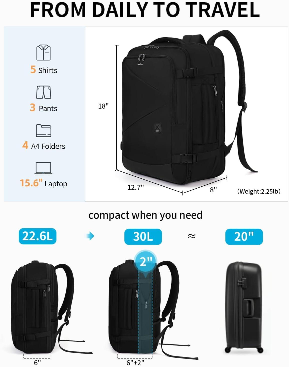 【22.6L/30L, From Daily to Travel】This expandable travel backpack adjusts from 18″ x 12.7″ x 6″ (22.6L) to 18″ x 12.7″ x 8″ (30L), providing flexible storage for your essentials—ideal for 2-4 day trips and daily work. It meets carry-on size requirements for major U.S. airlines like American, Delta, United, and Alaska, letting you travel WITHOUT BAGGAGE FEES. With high-quality SBS zippers, enjoy effortless access and long-lasting durability. (PATENT PENDING)