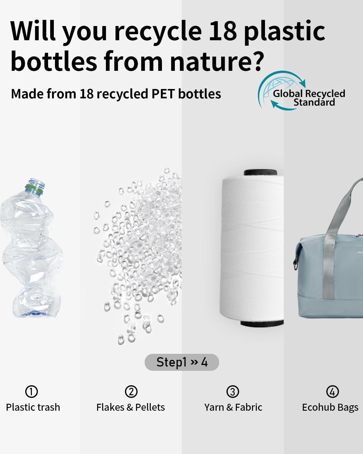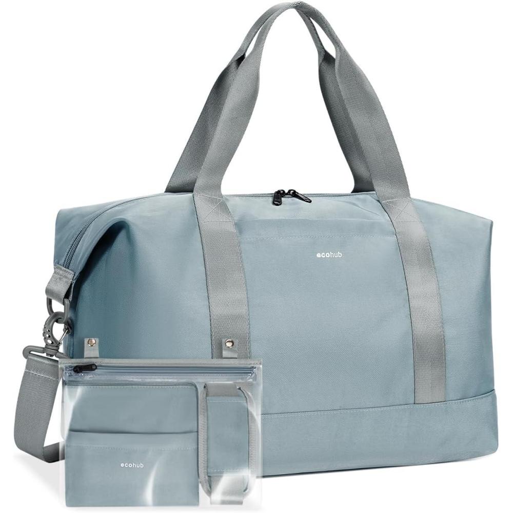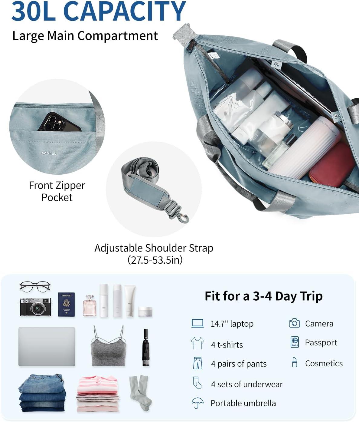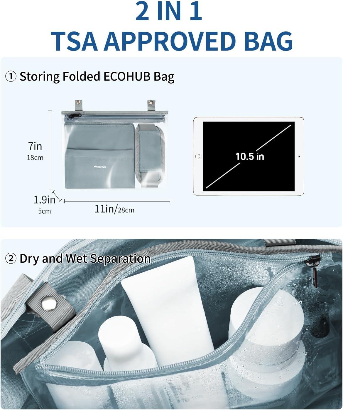 【SPACIOUS & 2 IN 1 WET BAG】: ECOHUB weekender bag offers a 30L main compartment and an exterior zipper pocket for quick access. The duffel can be fold into a wet bag when not in use. It includes a detachable, leak-proof TSA-approved wet bag for toiletries.