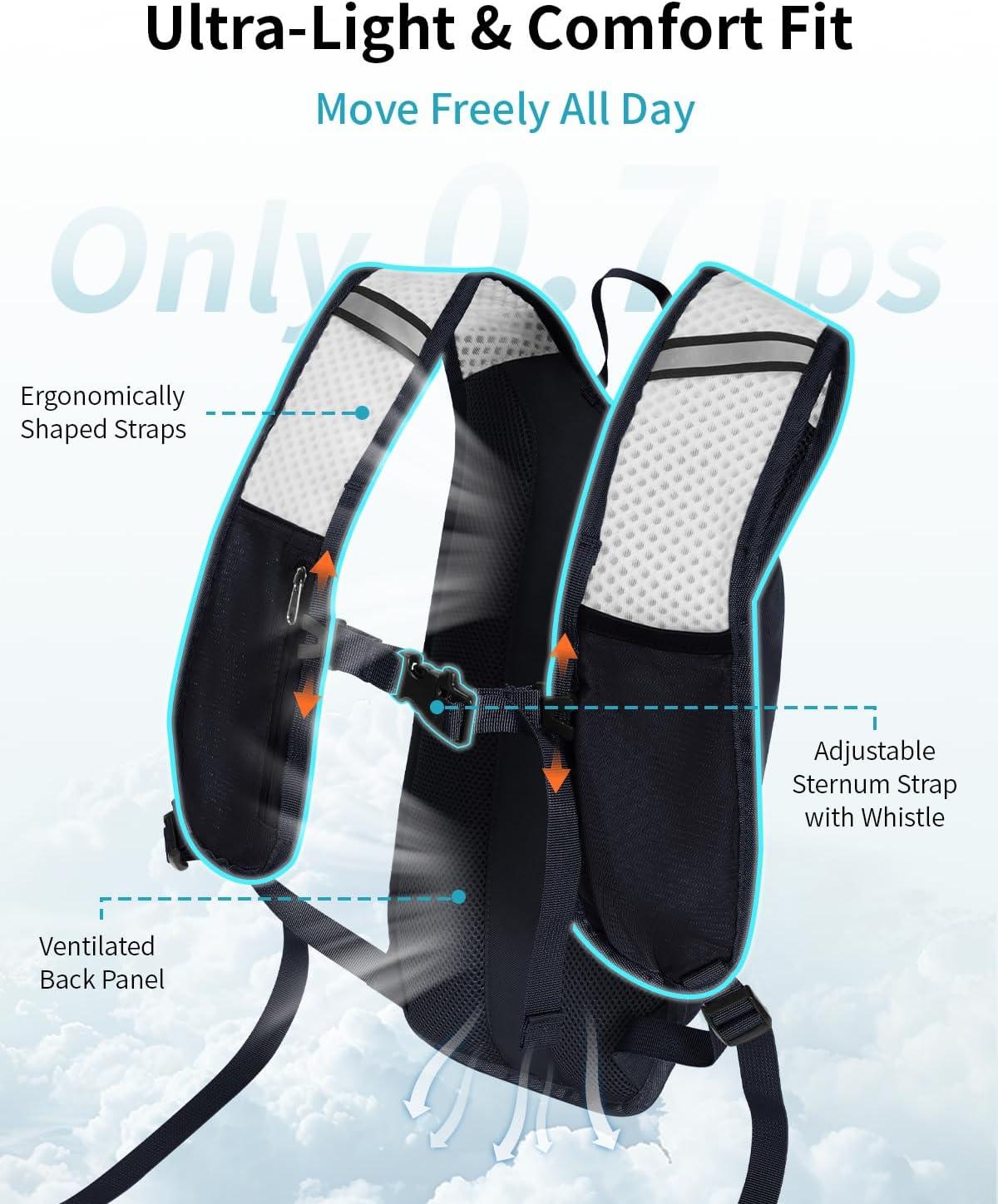 【Lightweight Design with Comfortable Fit】 Compact and lightweight hydration pack reduces shoulder strain. Adjustable shoulder and chest straps create a secure, bounce-free fit for both men and women.