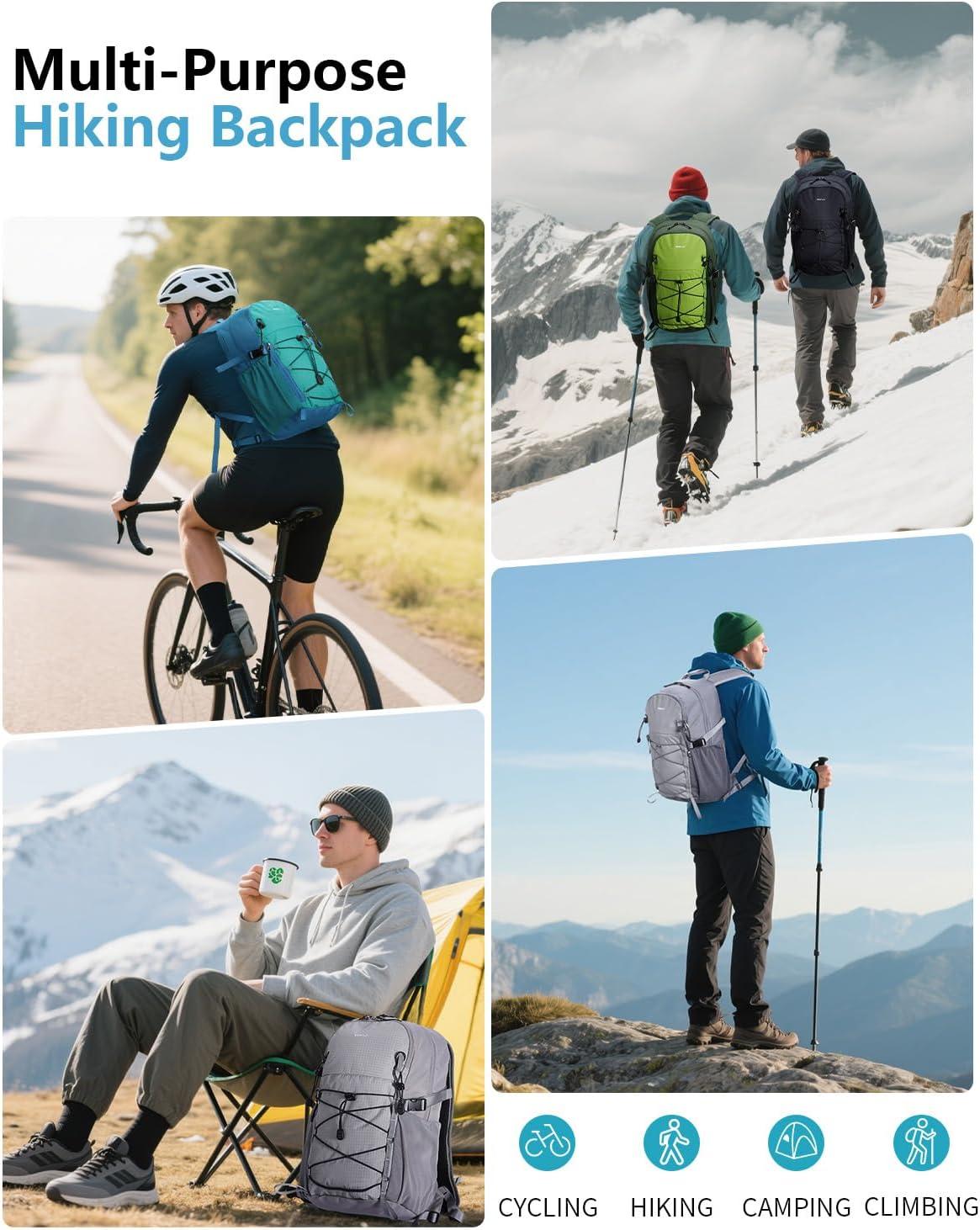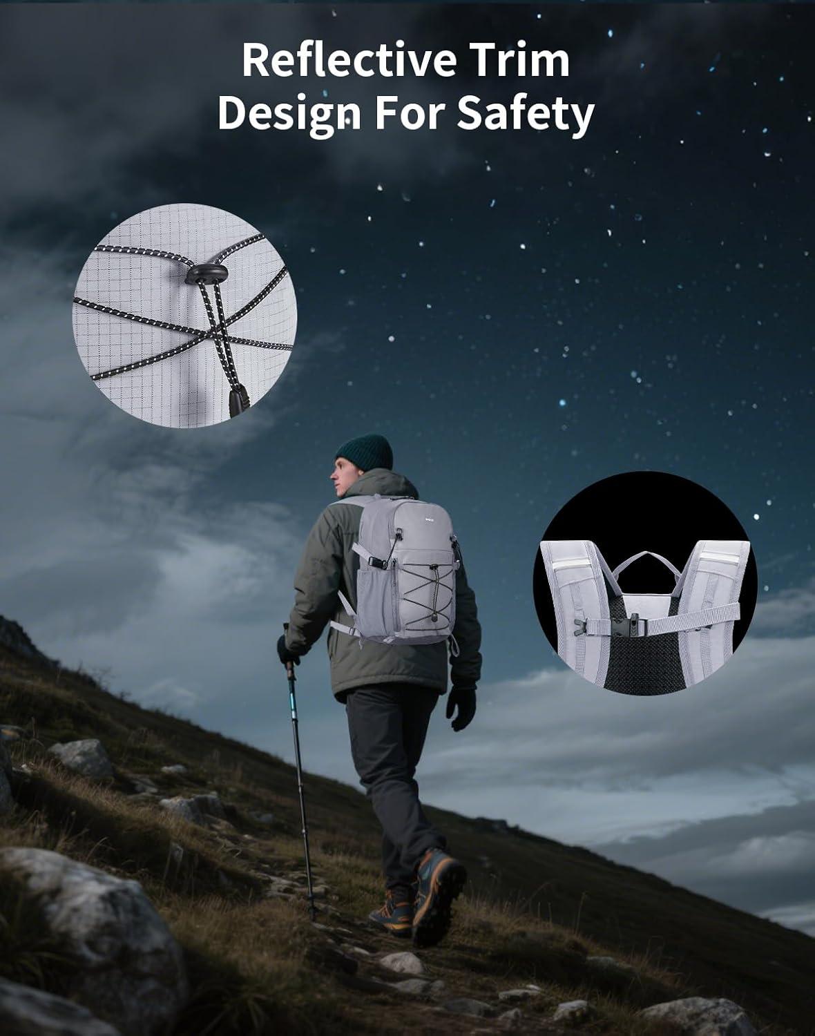 【Unique Details Design】 Adjustable sternum strap with safety whistle design. Reflective trim and rubber band rope design for enhanced safety during nighttime travels. Stabilization system consisting of adjustable sternum strap and waist straps keeps the pack stable and comfortable during hikes. The sides of the backpack have elastic and fasteners that can store trekking pole. Hook mechanism on the front pocket for attaching various items.