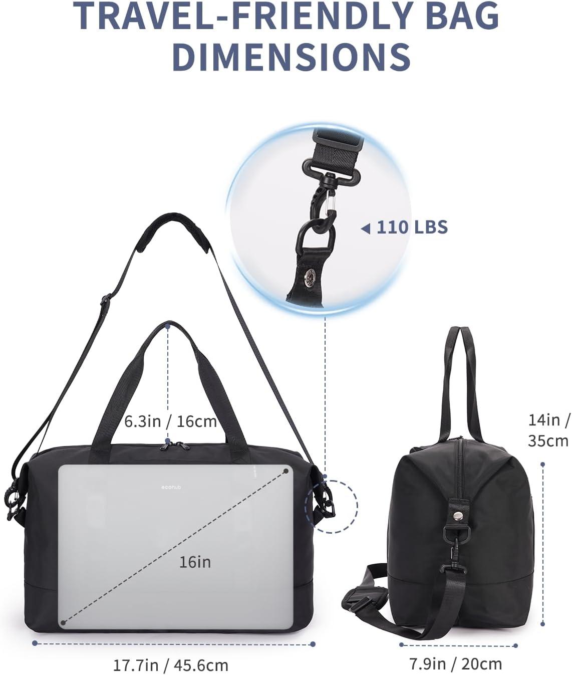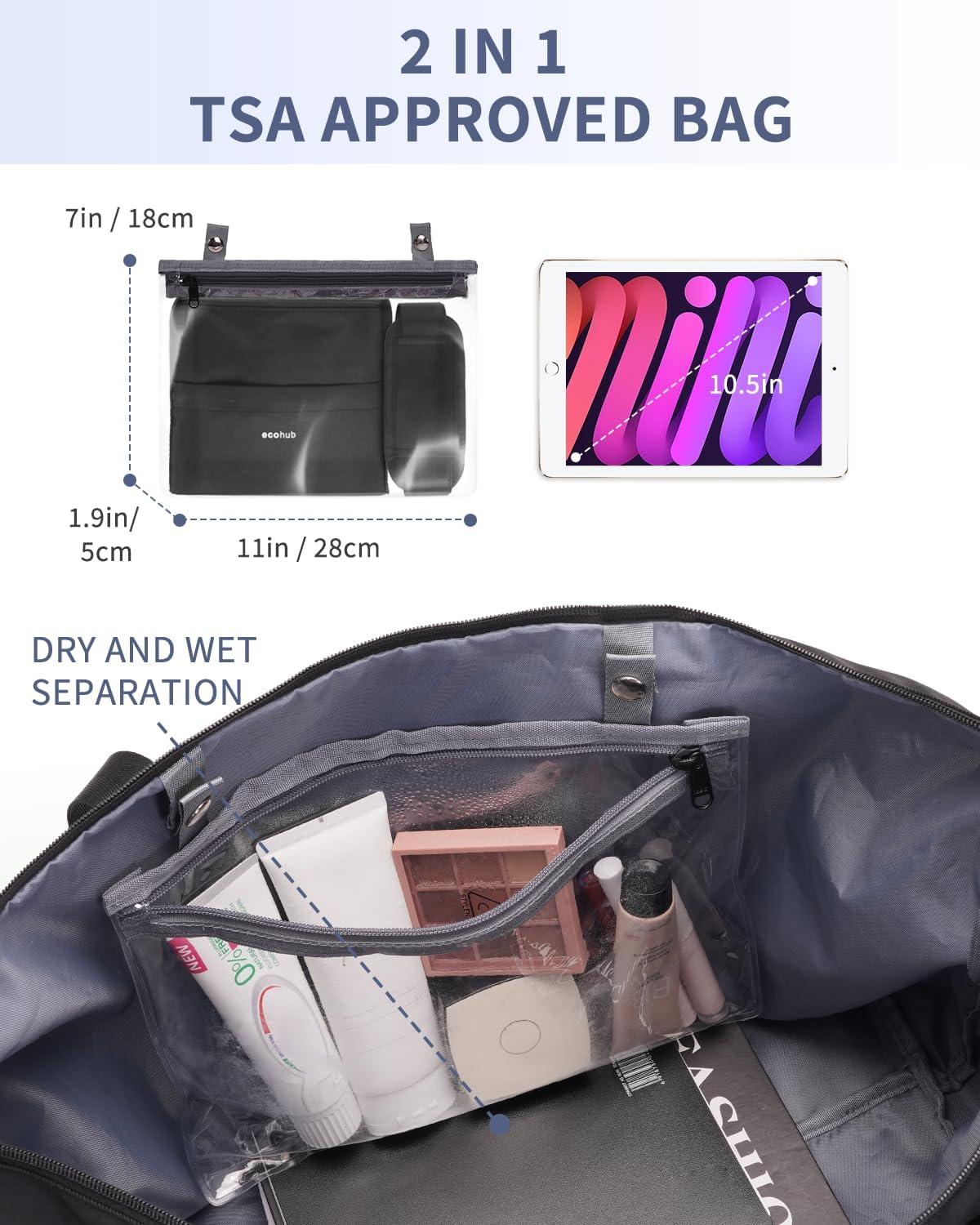 【SPACIOUS & 2 IN 1 WET BAG】: ECOHUB weekender bag offers a 30L main compartment and an exterior zipper pocket for quick access. The duffel can be fold into a wet bag when not in use. It includes a detachable, leak-proof TSA-approved wet bag for toiletries