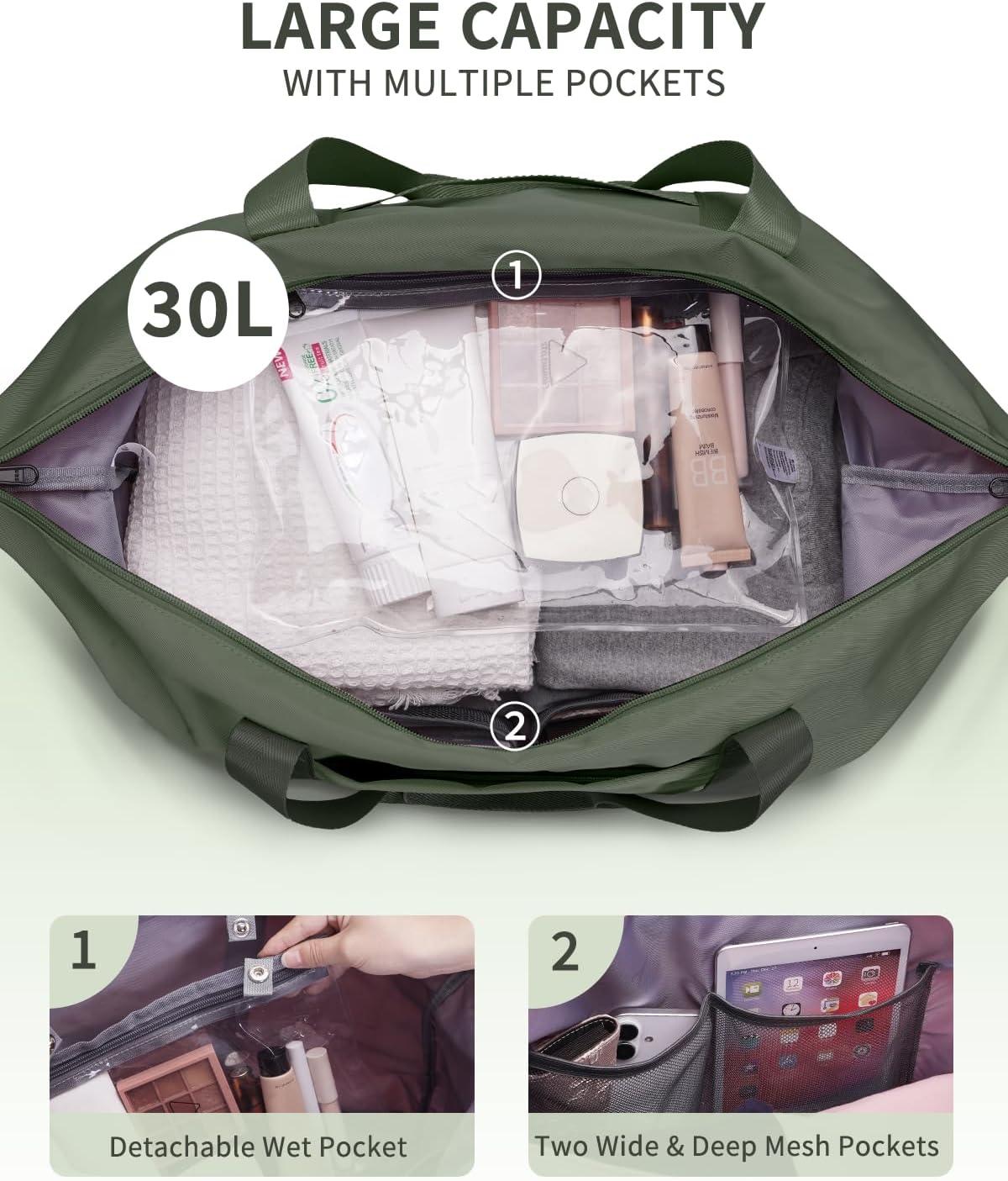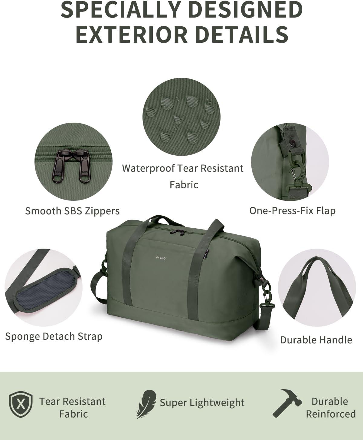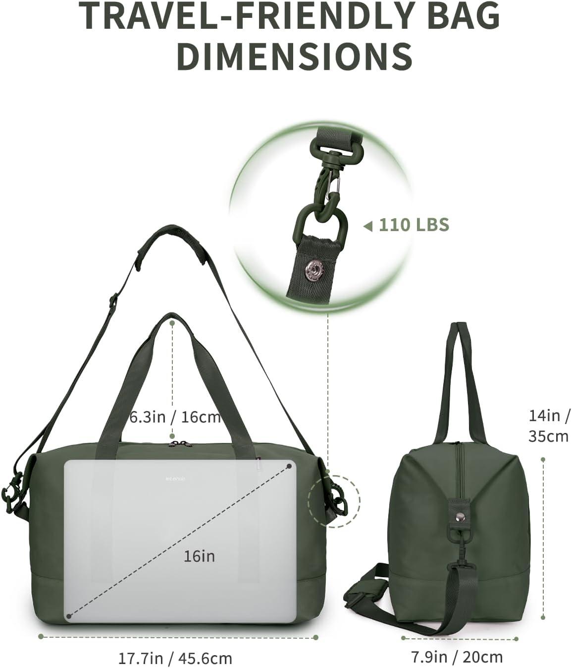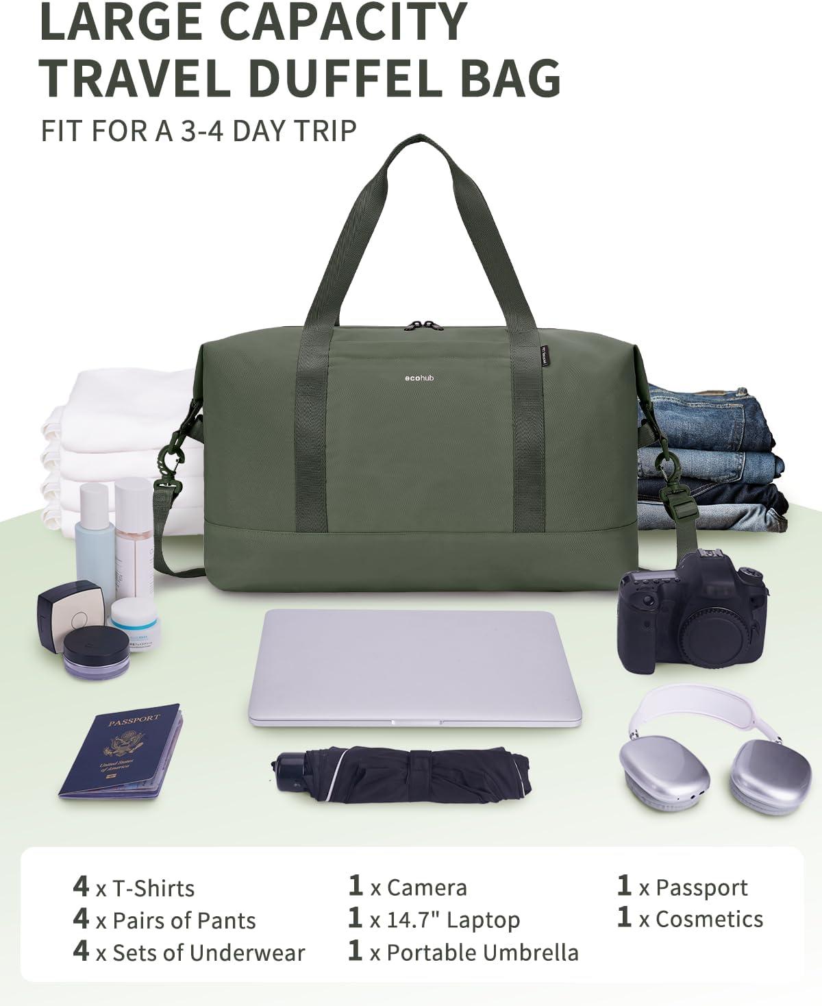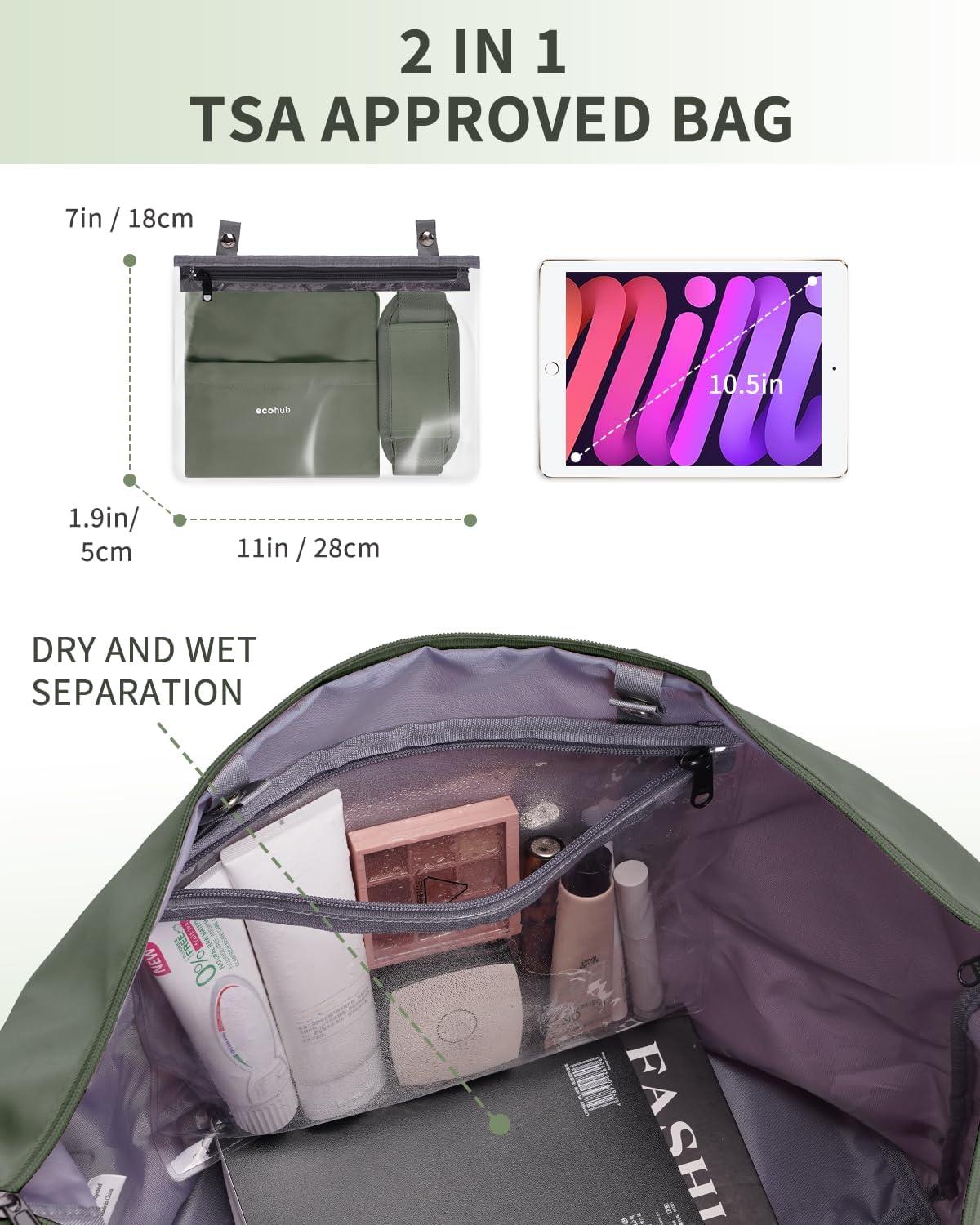 【SPACIOUS & 2 IN 1 WET BAG】: ECOHUB weekender bag offers a 30L main compartment and an exterior zipper pocket for quick access. The duffel can be fold into a wet bag when not in use. It includes a detachable, leak-proof TSA-approved wet bag for toiletries