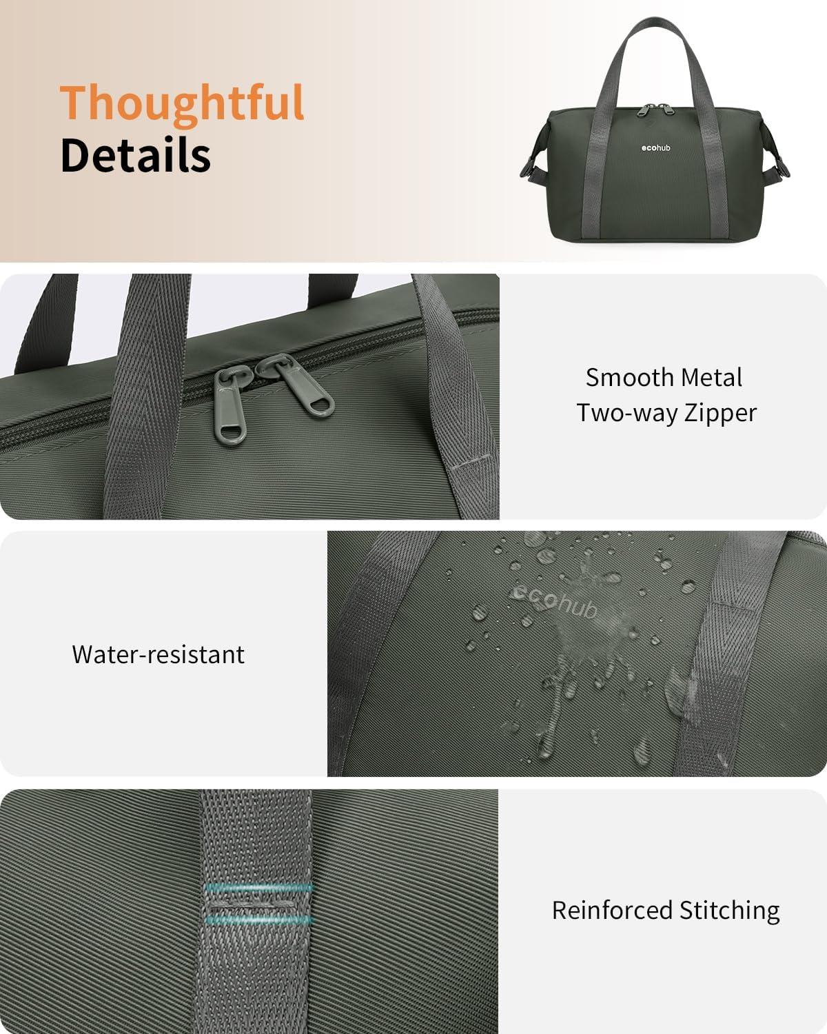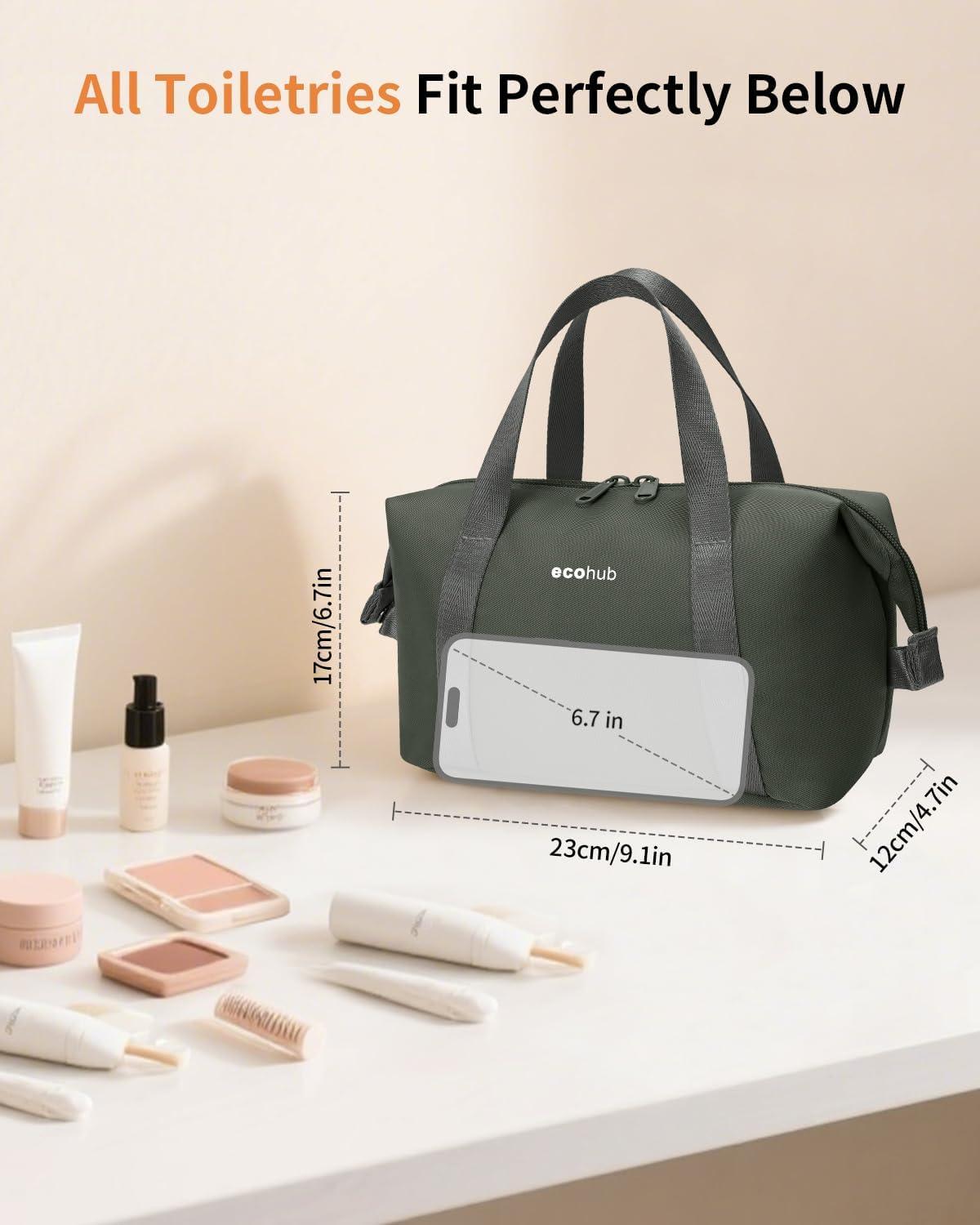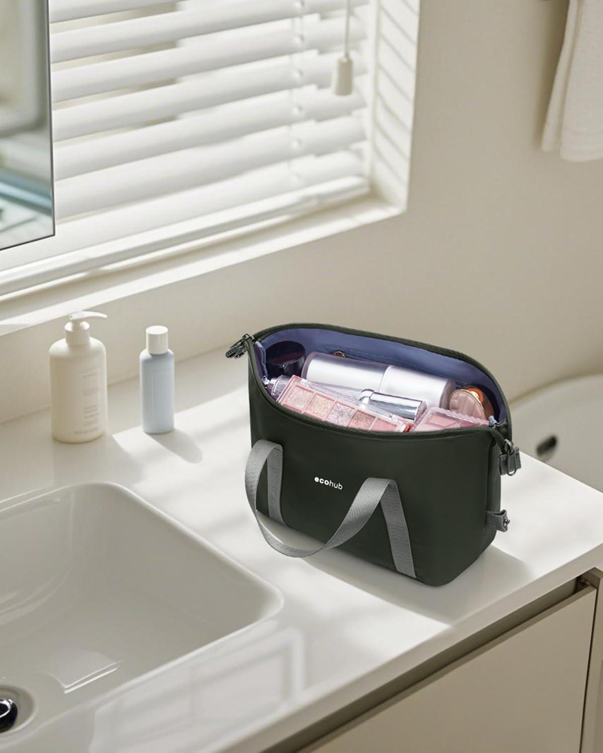 【Spacious & Organized Storage】: With a wide-mouth opening and multiple compartments (inner zipper pocket + 2 small item pockets), ECOHUB toiletry bag offers ample space for all your essentials—makeup, skincare, toiletries, and more. The 9.1in x 4.7in x 6.7in (23cm x 12cm x 17cm) dimensions fit perfectly in luggage or on bathroom counters, keeping items neatly organized and easily accessible.