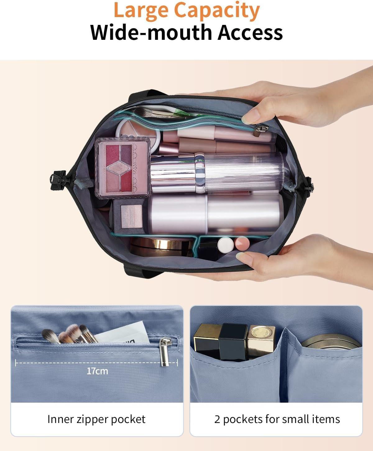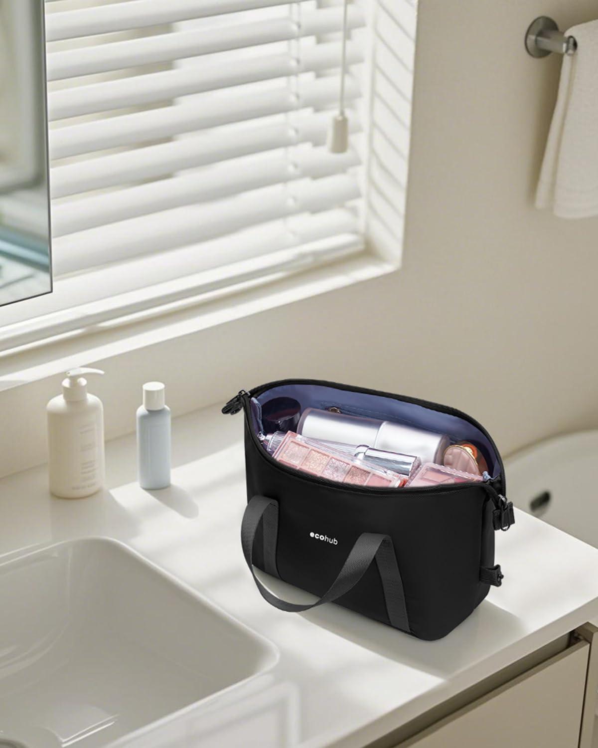 【Spacious & Organized Storage】: With a wide-mouth opening and multiple compartments (inner zipper pocket + 2 small item pockets), ECOHUB toiletry bag offers ample space for all your essentials—makeup, skincare, toiletries, and more. The 9.1in x 4.7in x 6.7in (23cm x 12cm x 17cm) dimensions fit perfectly in luggage or on bathroom counters, keeping items neatly organized and easily accessible.