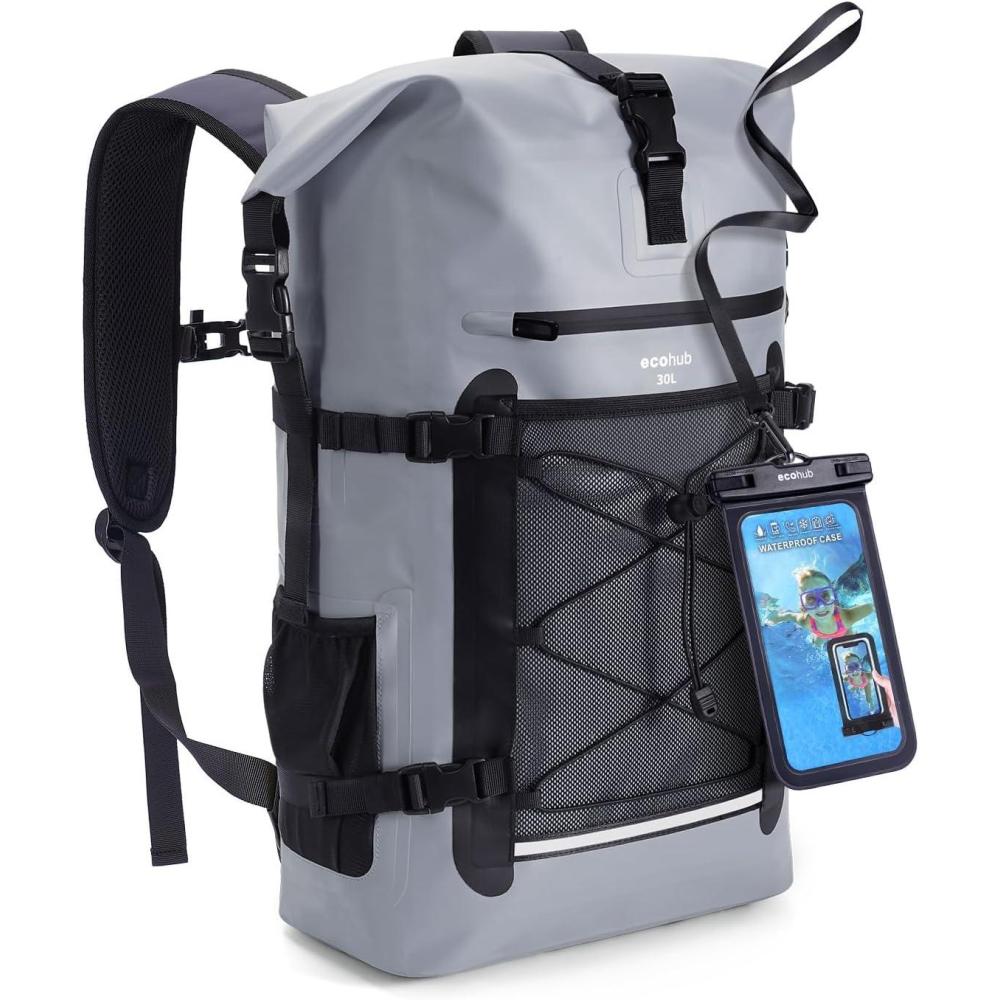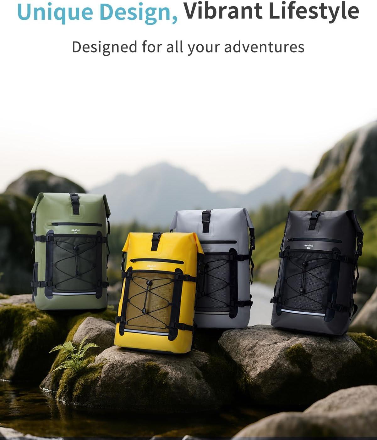 【Complete Waterproof Protection Backpack】 Ecohub dry bags waterproof utilize high-frequency stitching technology, no pinholes, 3 layers 500D PVC heavy duty woven mesh durable material, 100% waterproof and airtight to ensure your gear stays completely dry while traveling, kayaking, biking, camping, and fishing. The surface waterproof material, facilitating easy cleaning – simply rinse with water and allow it to dry.